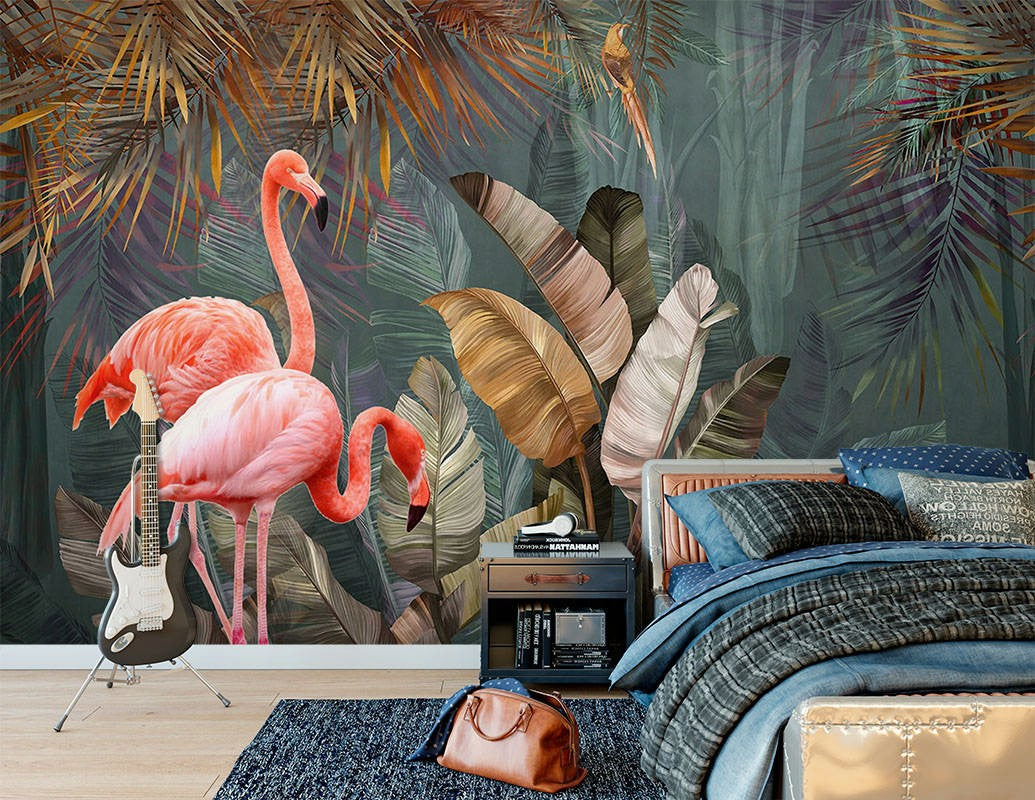 Flamingoes Animals Birds Green Wallpaper Mural,Self-Adhesive Peel And Stick 3D Wall Art,Designer Bedroom Wall Decor