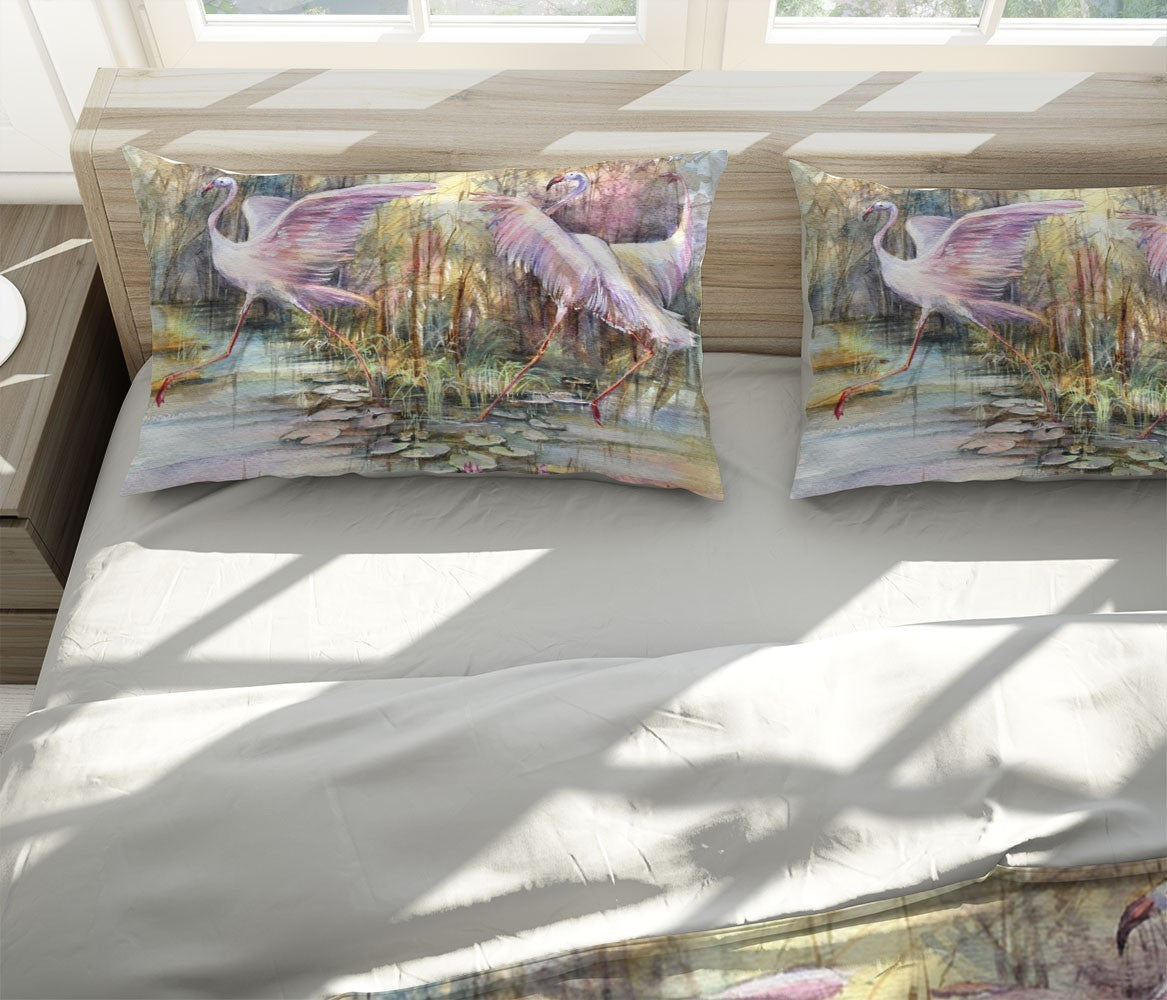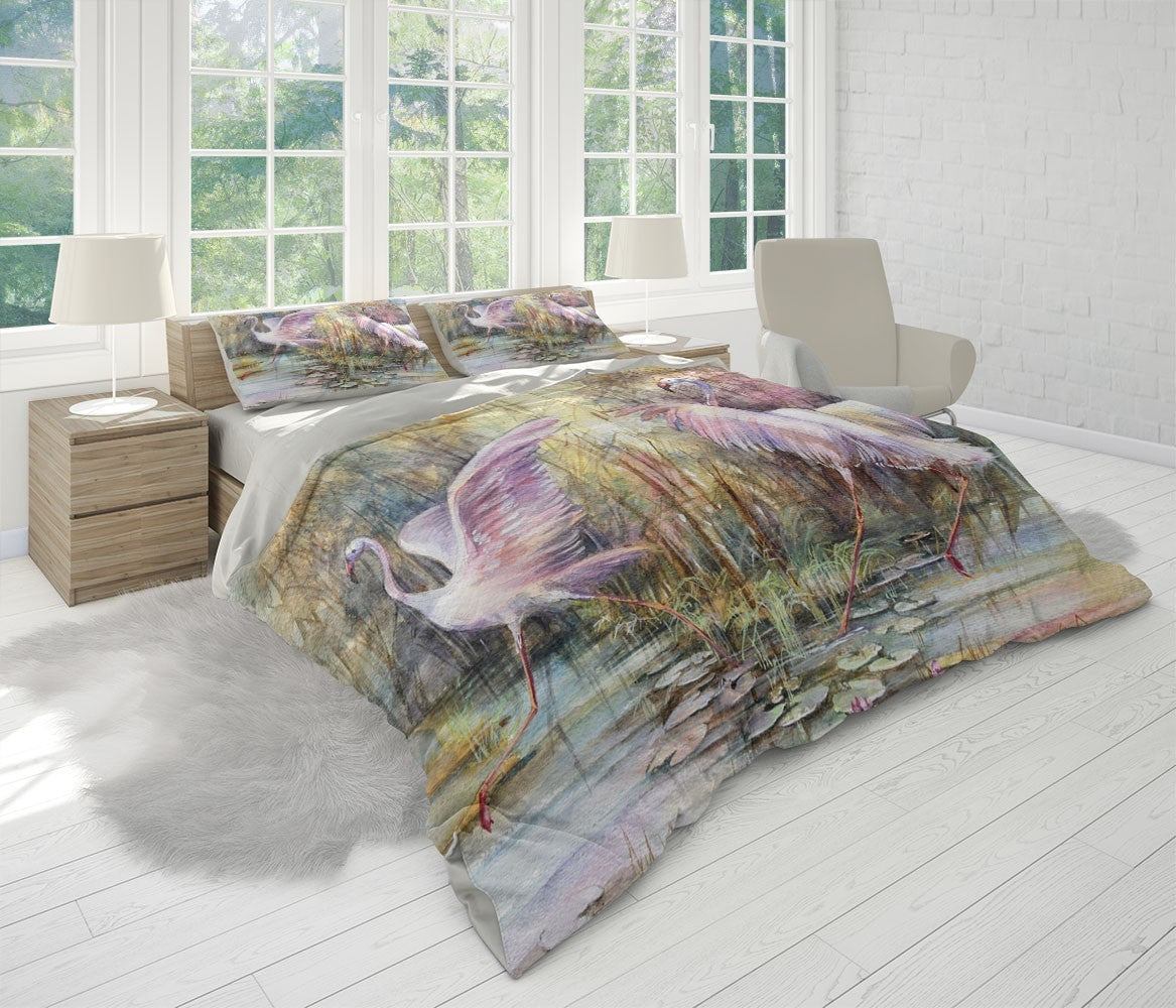 Flamingoes Painting Duvet Cover Set W Pillow Cover, Pink Animals Birds 3D Quilt Cover, Single Double Queen King Size Doona Cover