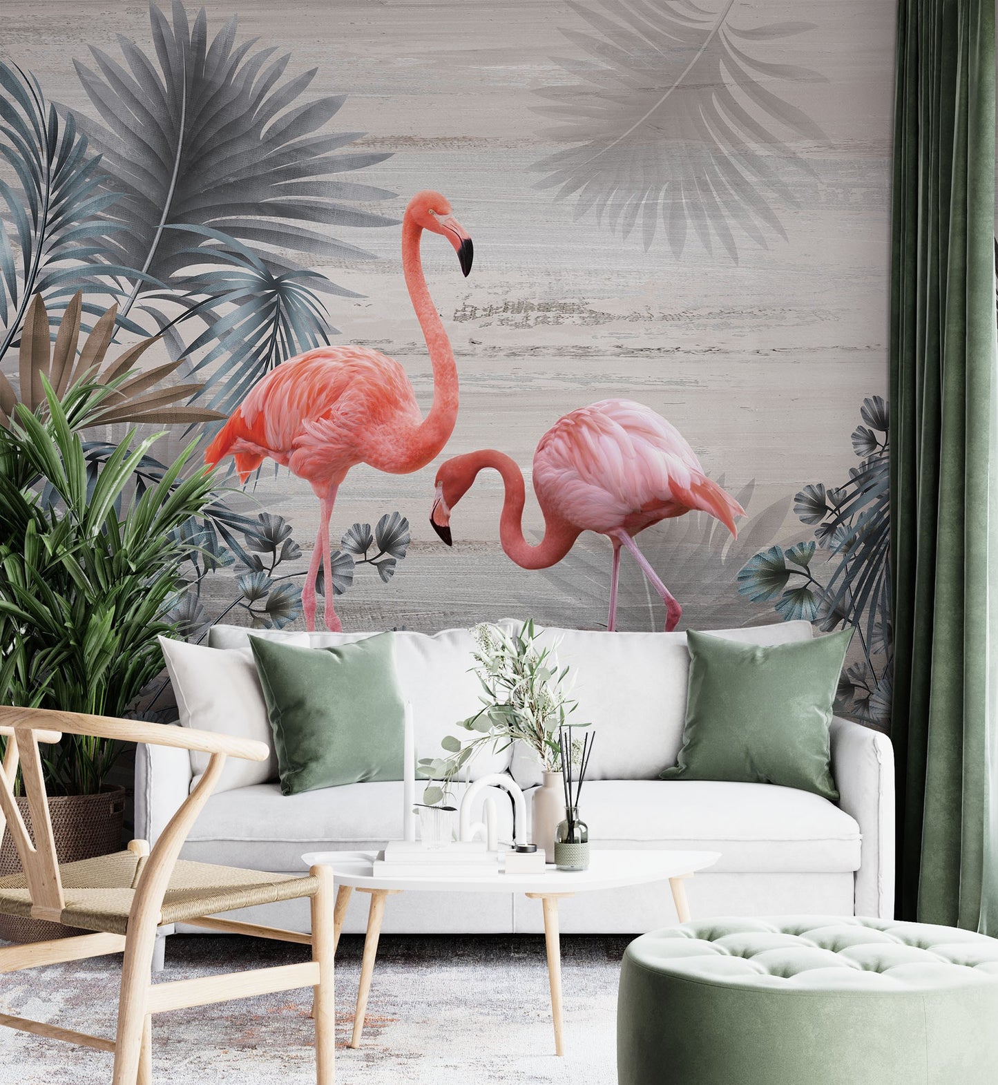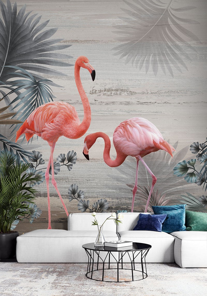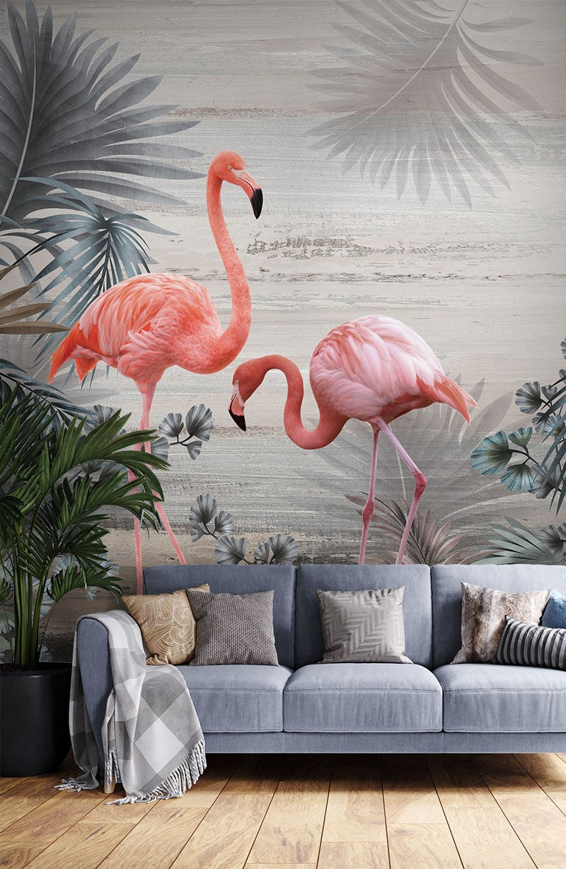 Flamingos Leaves Animals Birds Pink Wallpaper Mural