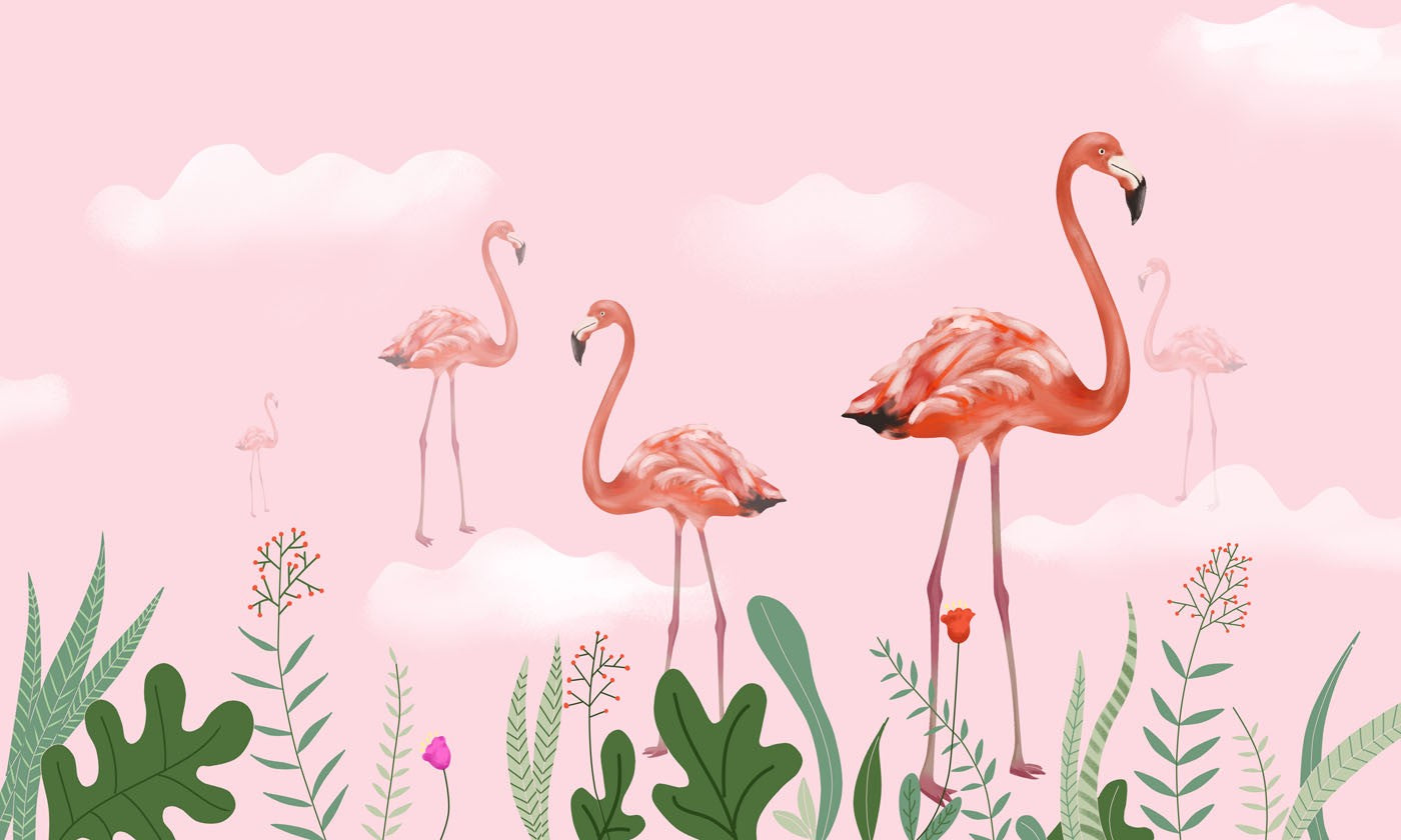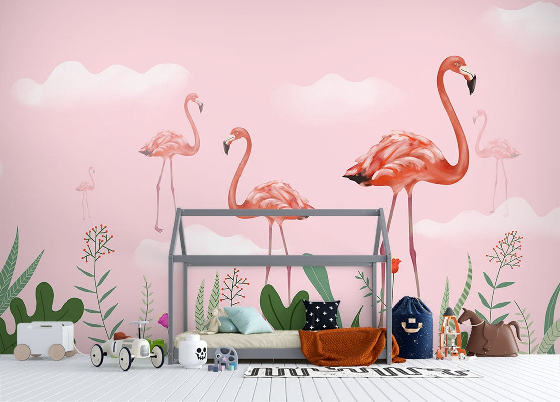 Flamingos Leaves Kids Animal Pink Wallpaper Mural,Self-Adhesive Peel And Stick 3D Wall Decal,Bedroom Designer Wall Decor