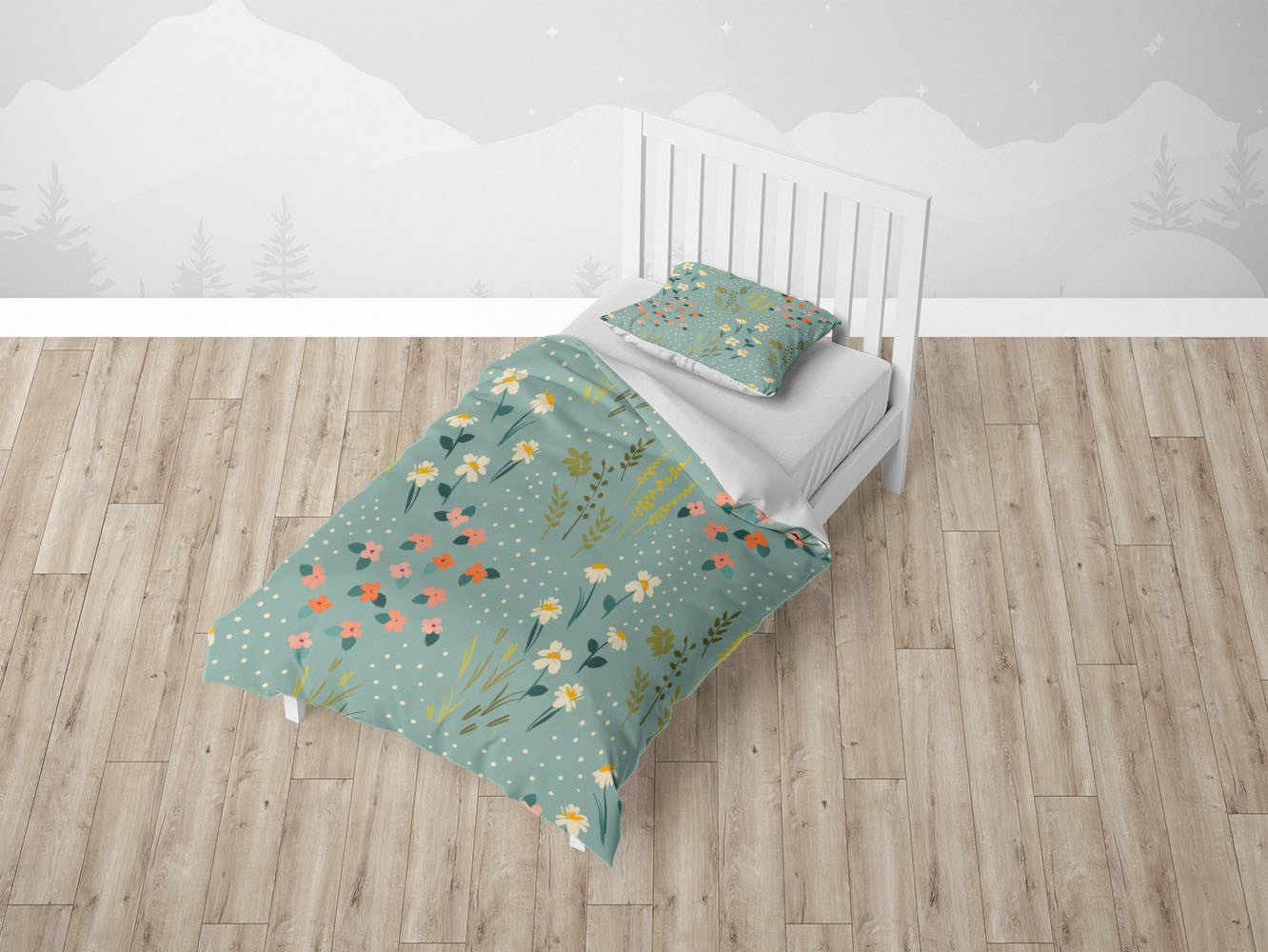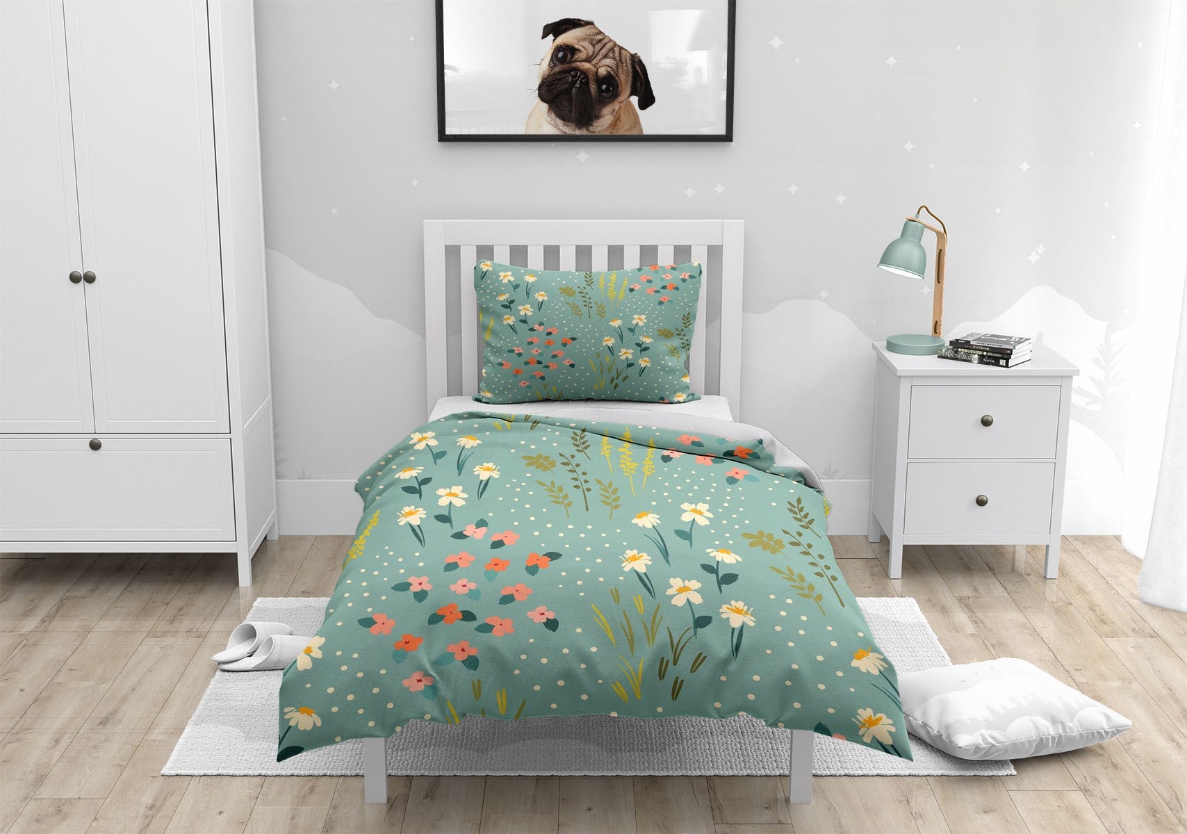Floral Daisy Duvet Cover Set w Pillowcases, Green Kids Patterns 3D Quilt Cover, 3pc Single Double Queen King Size Doona Cover