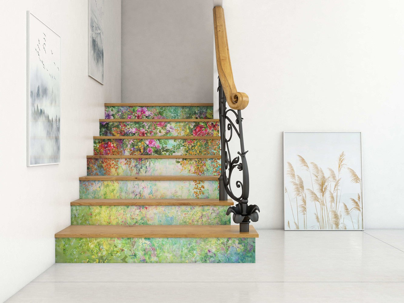Floral Wall Floral Flowers Bright Stair Riser Decals, Waterproof Removable Staircase Decals, Vinyl Peel And Stick Stairs Decal Stickers