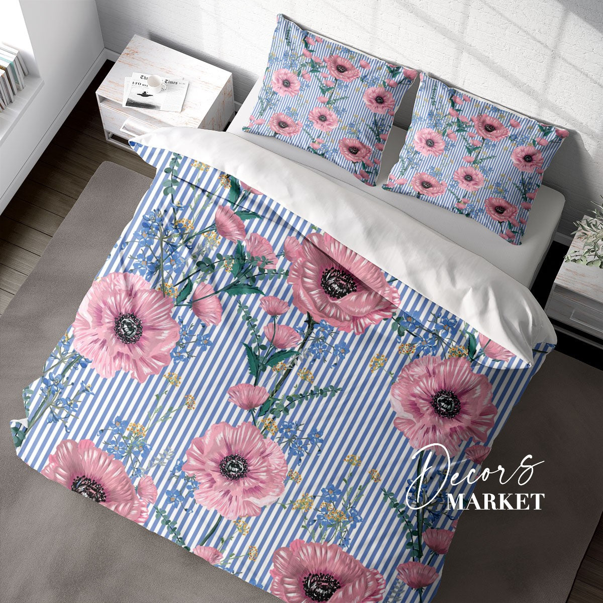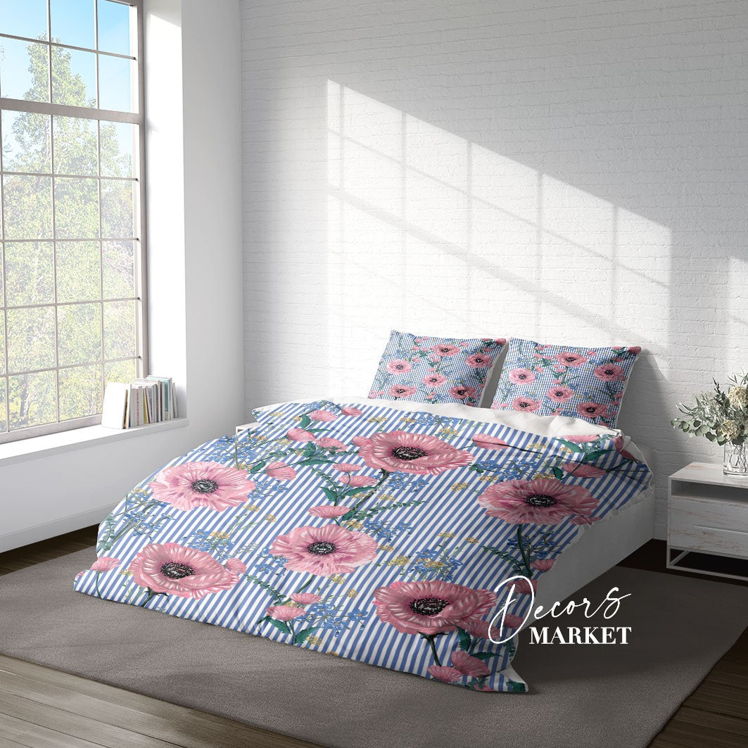Flowers And Stripes Duvet Cover Set w Pillowcases, Pink Floral Flowers 3D Quilt Cover, 3pc Single Double Queen King Size Doona Cover