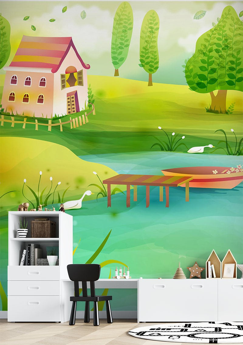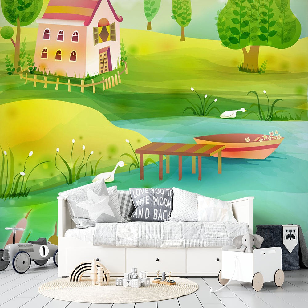 Forest Chalet Kids Fantasy Green Wallpaper Mural,Self-Adhesive Peel And Stick 3D Wall Decal,Australian Company Bedroom Wall Decor