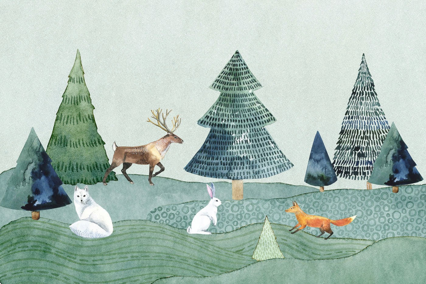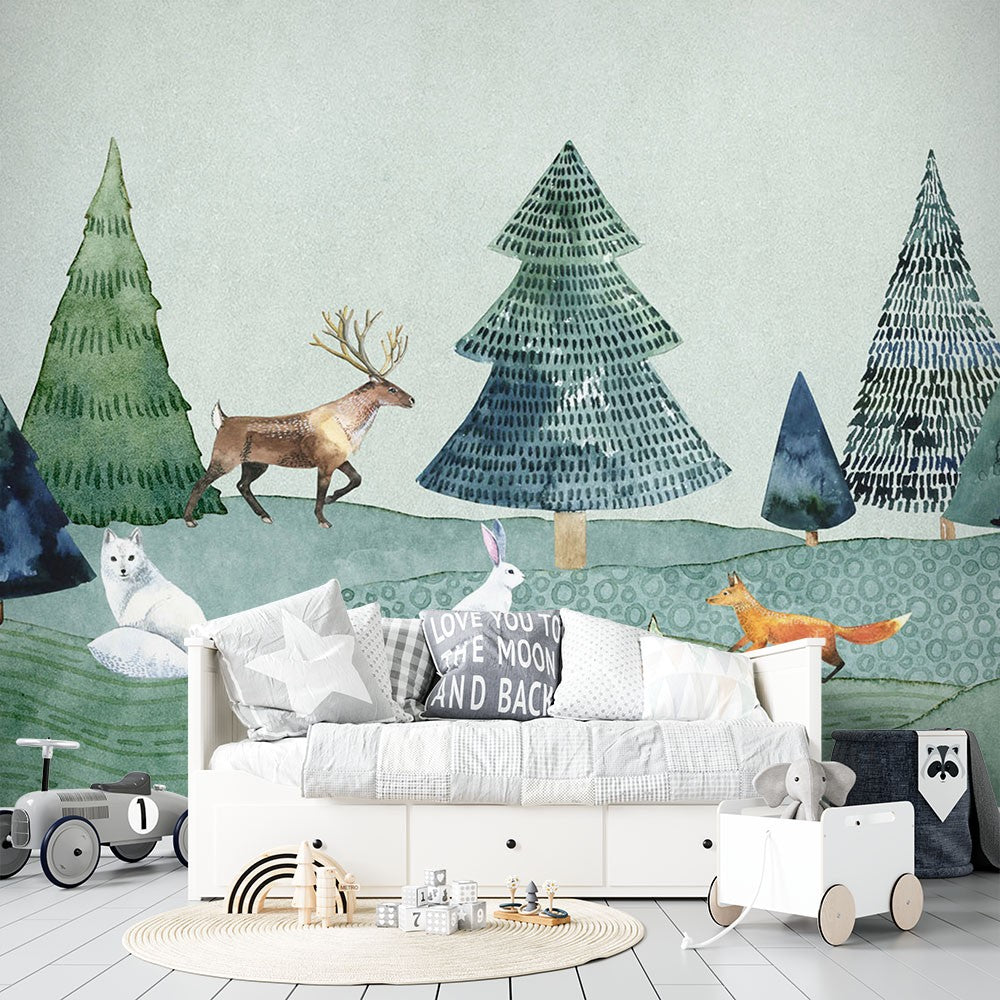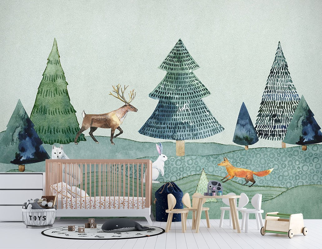 Forest Fox Kids Animal Green Wallpaper Mural,Self-Adhesive Peel And Stick 3D Wall Mural,Removable Bedroom Wall Decor