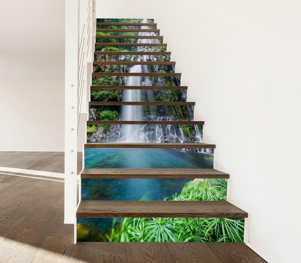 Forest Lake Nature Waterfall Green Stair Riser Decals, Waterproof Removable Staircase Decals, Vinyl Peel And Stick Stairs Decal Stickers