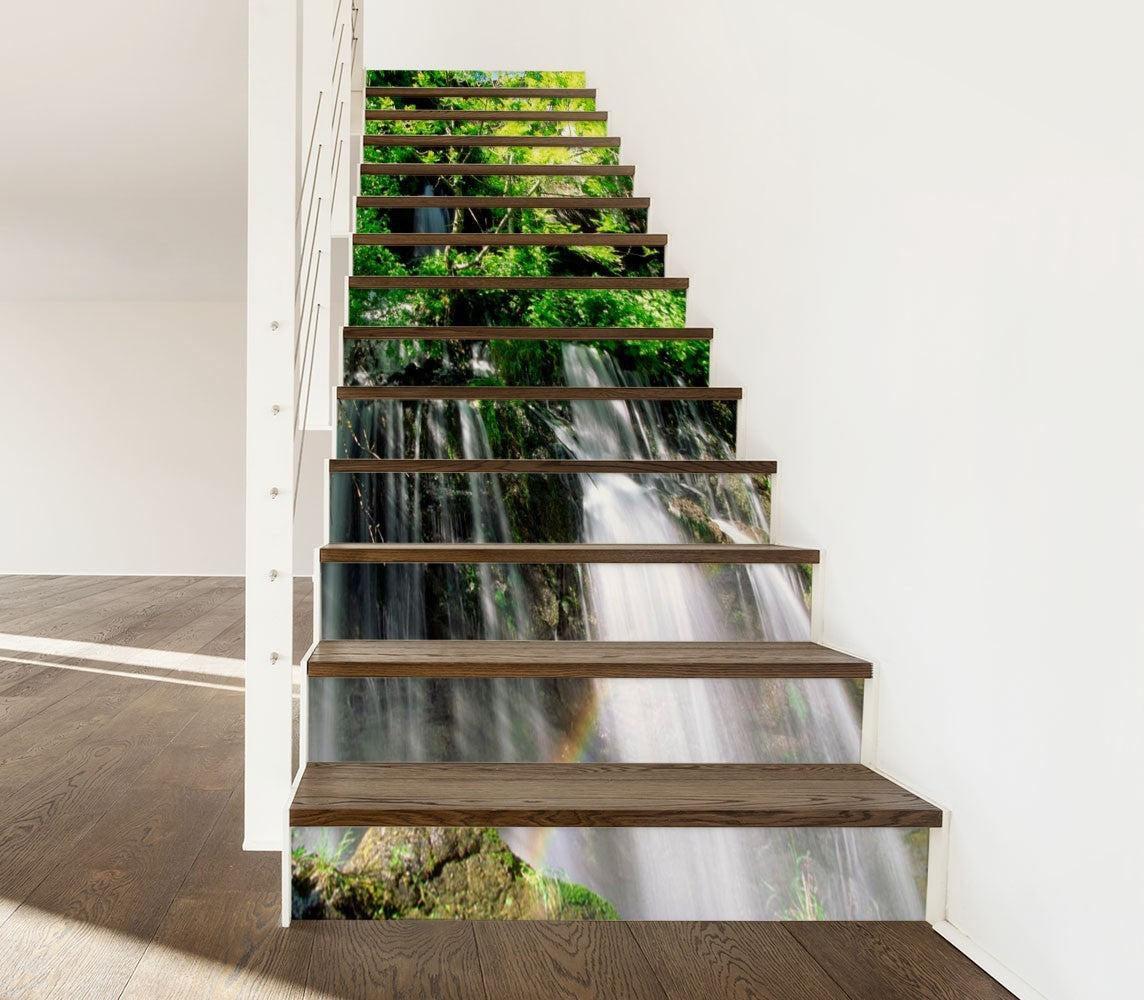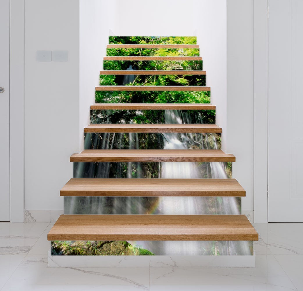 Forest Tree Nature Waterfall Green Stair Riser Decals, Waterproof Removable Staircase Decals, Vinyl Peel And Stick Stairs Decal Stickers