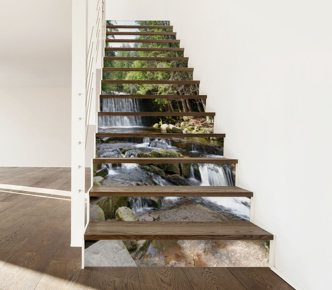 Forest Waterfall Nature Brown Stair Riser Decals, Waterproof Removable Staircase Decals, Vinyl Peel And Stick Stairs Decal Stickers