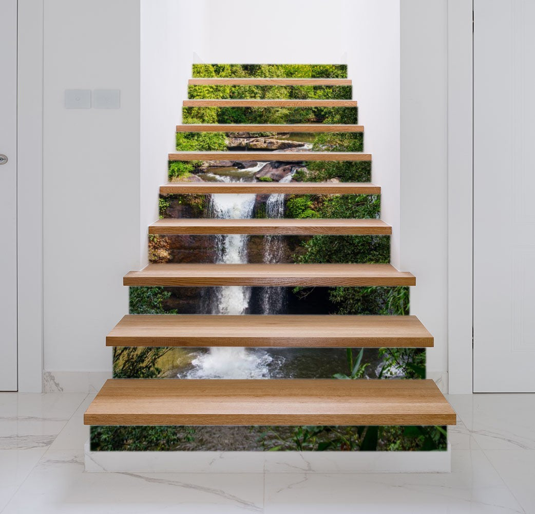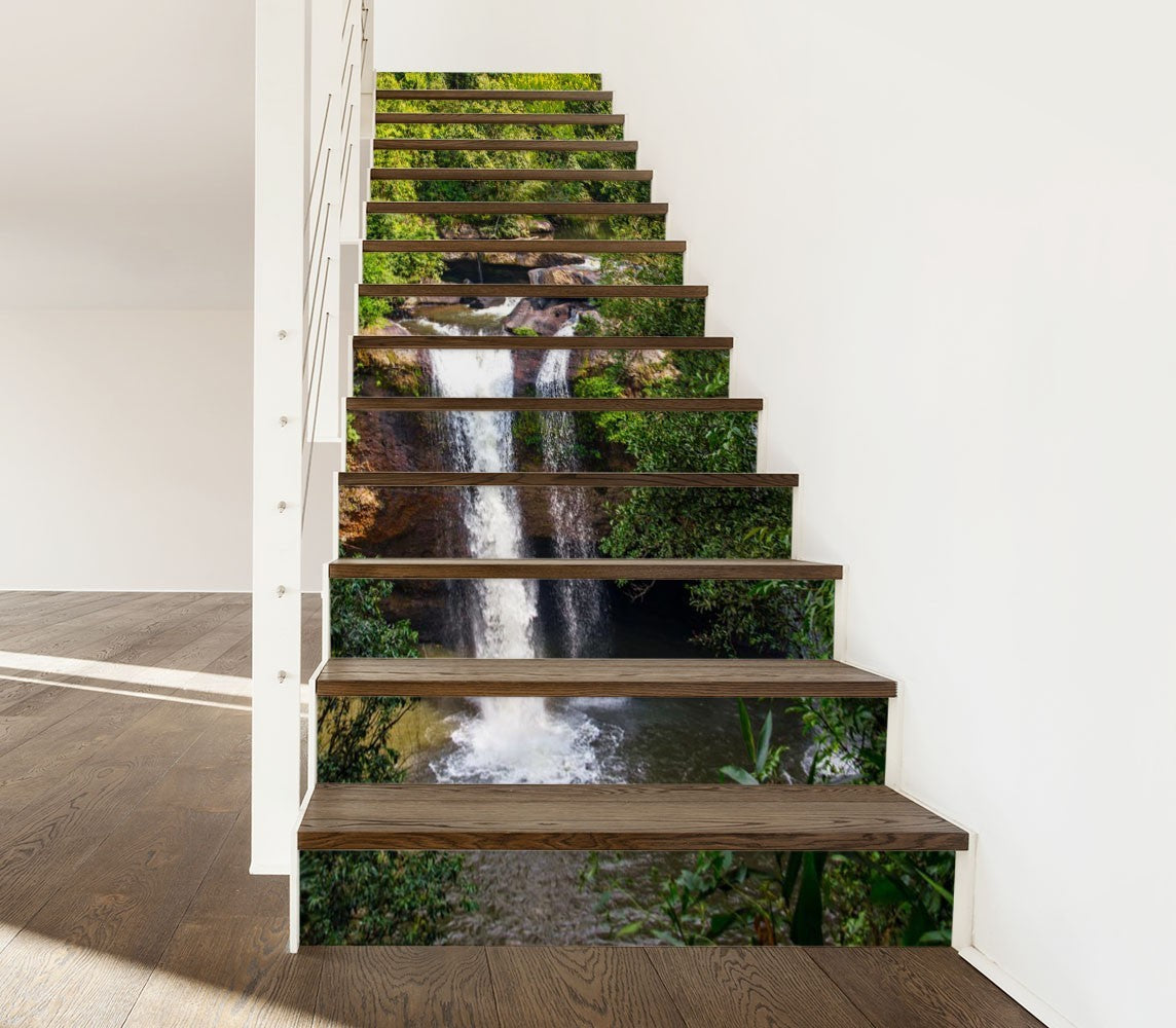 Forest Waterfall Nature Green Stair Riser Decals, Waterproof Removable Staircase Decals, Vinyl Peel And Stick Stairs Decal Stickers