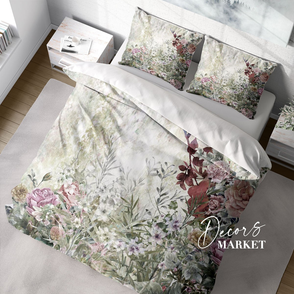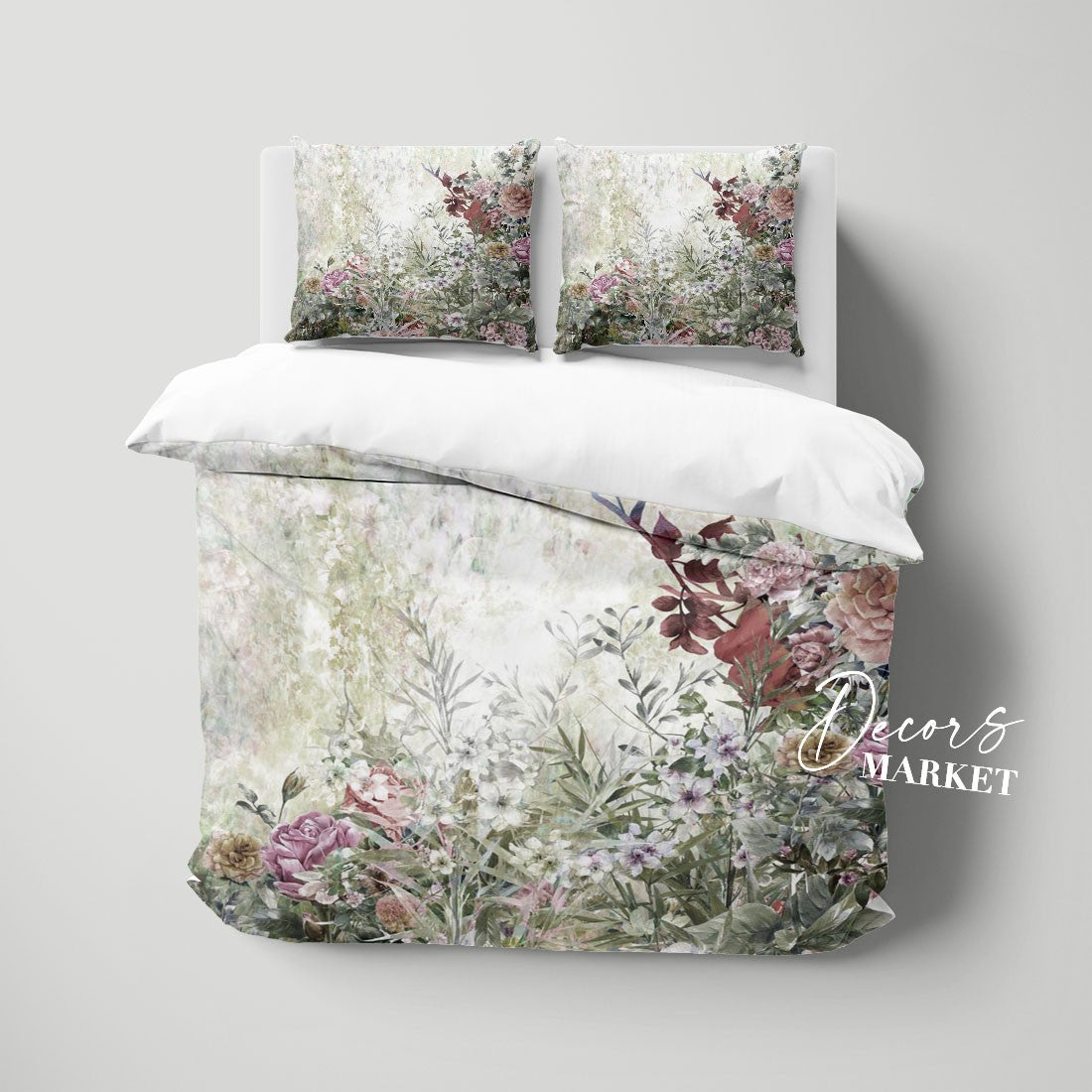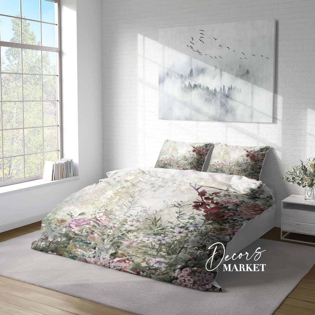 Garden Watercolor Duvet Cover Set w Pillowcases, Green Floral Flowers 3D Quilt Cover, 3pc Single Double Queen King Size Doona Cover