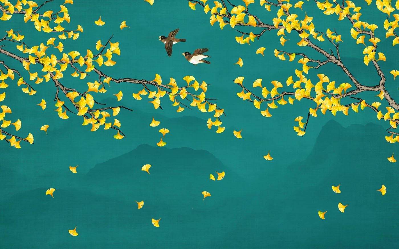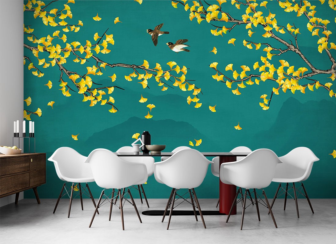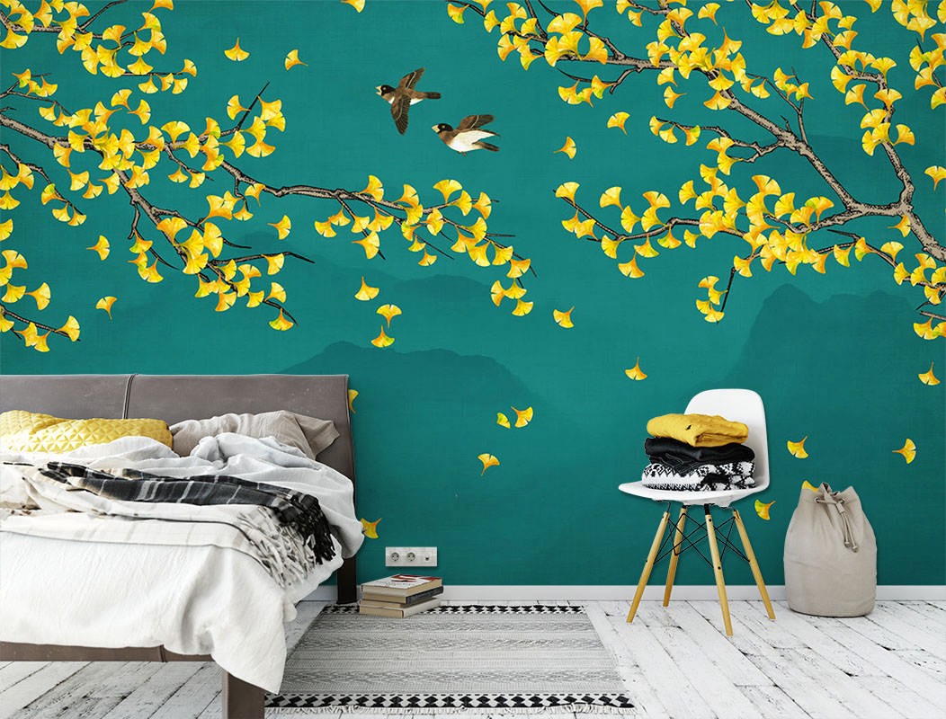 Gingko Leaves Floral Green Wallpaper Mural,Self-Adhesive Peel And Stick 3D Wall Decal,Designer Australian Company Wall Decor