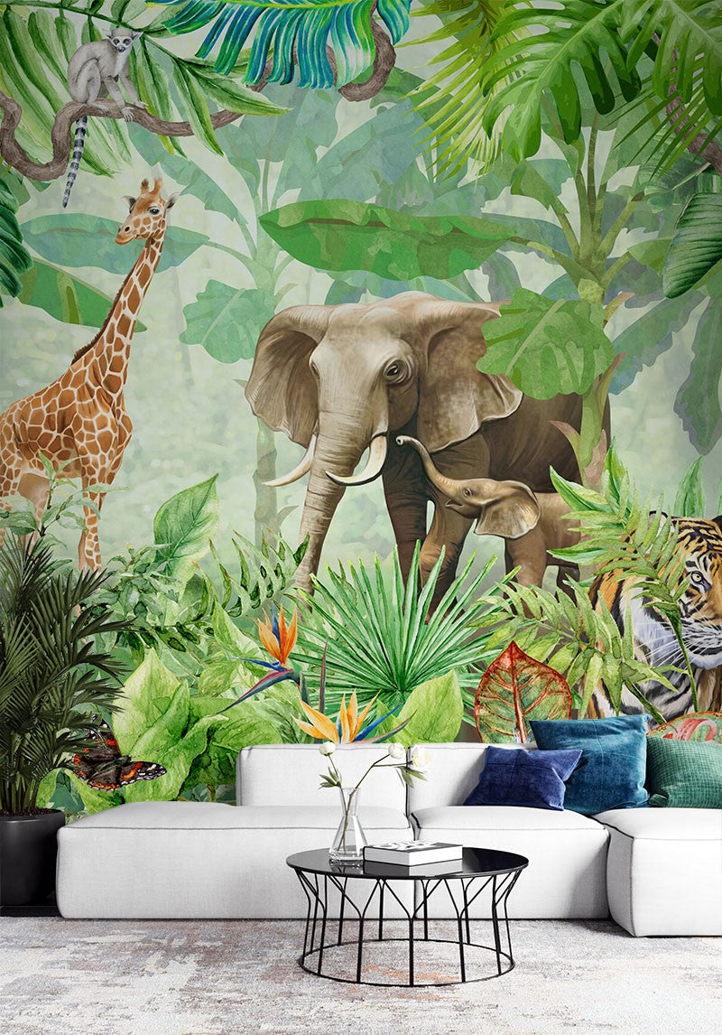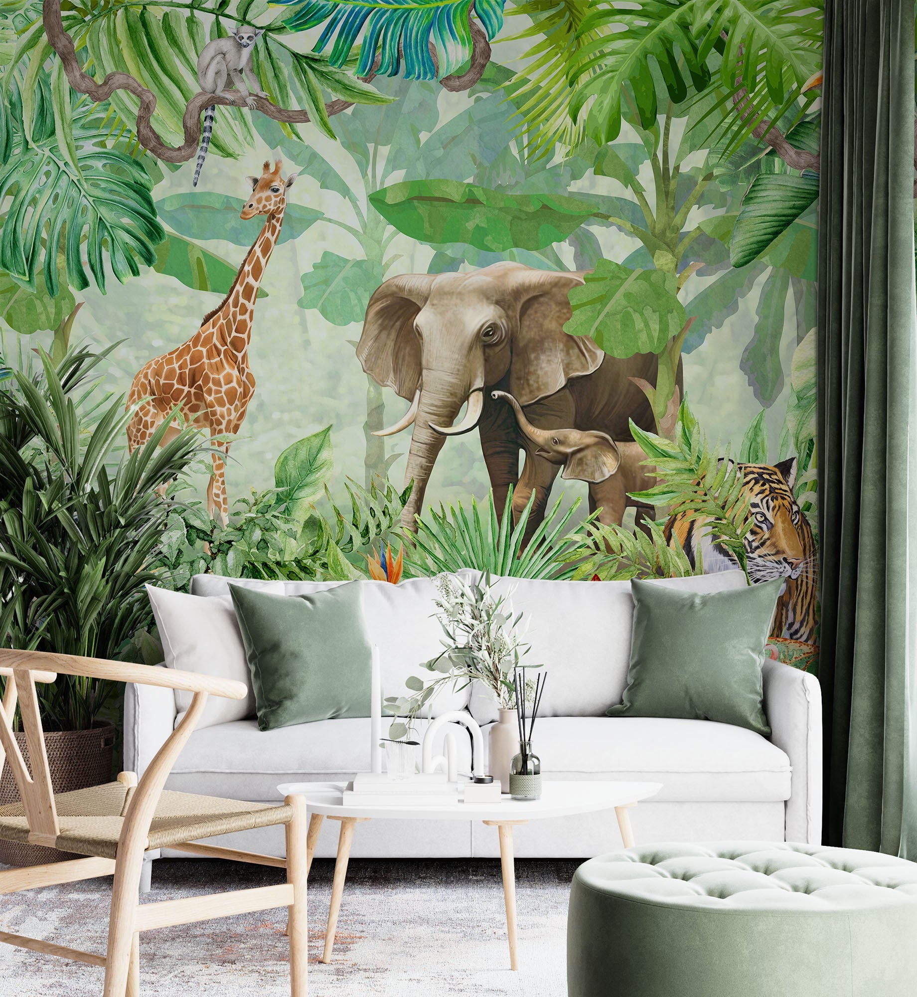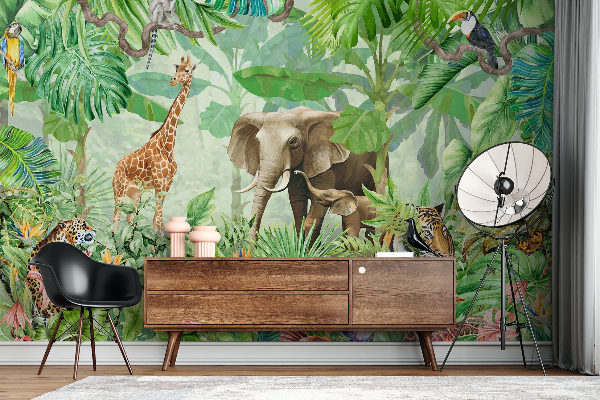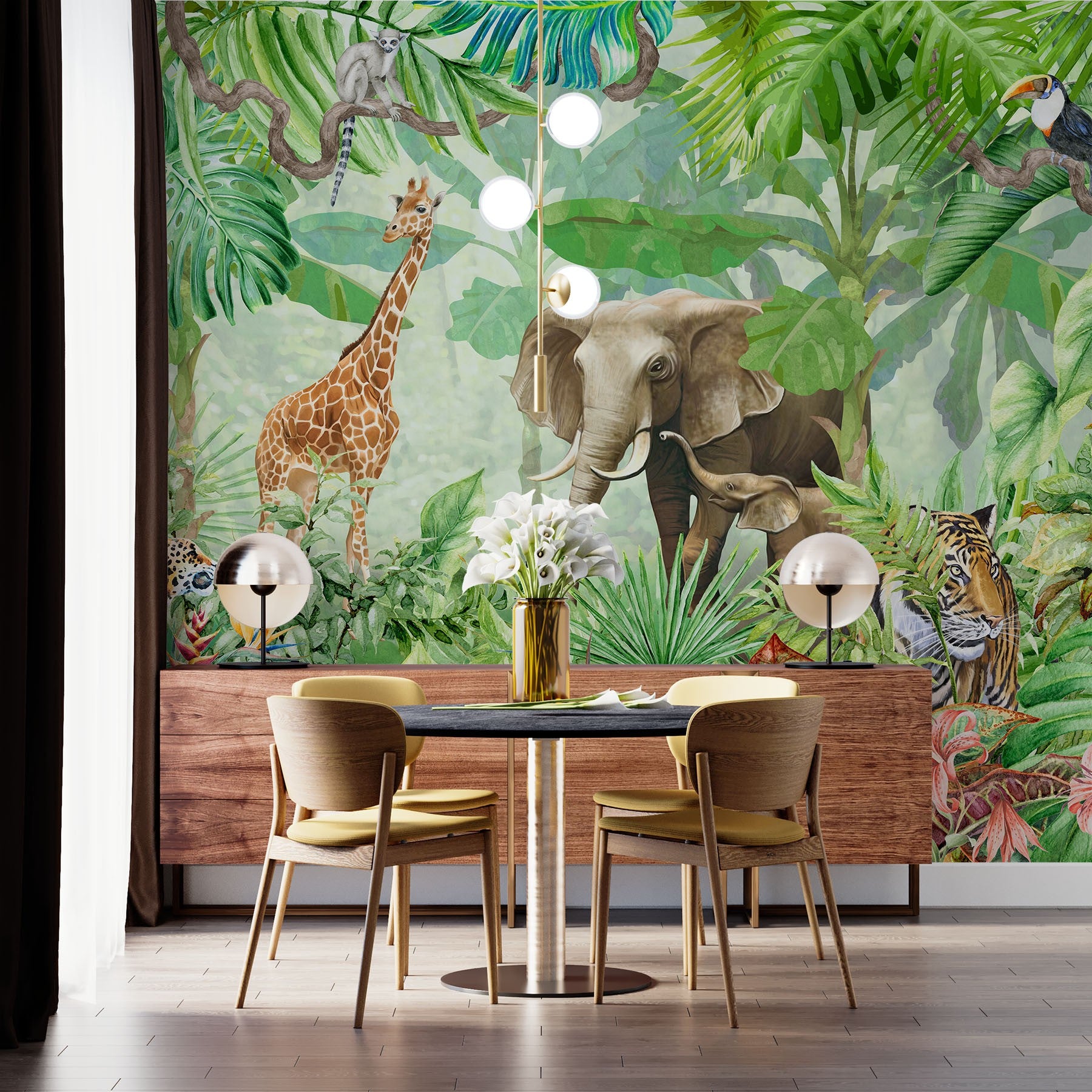 Giraffe Elephant Kids Animal Green Wallpaper Mural