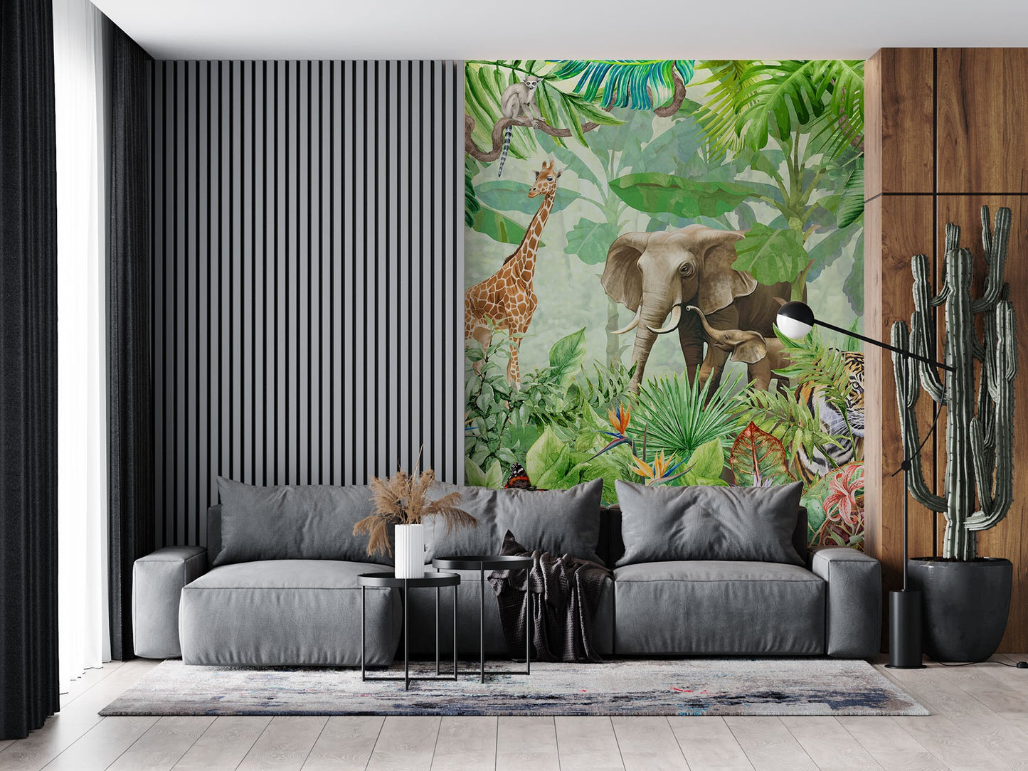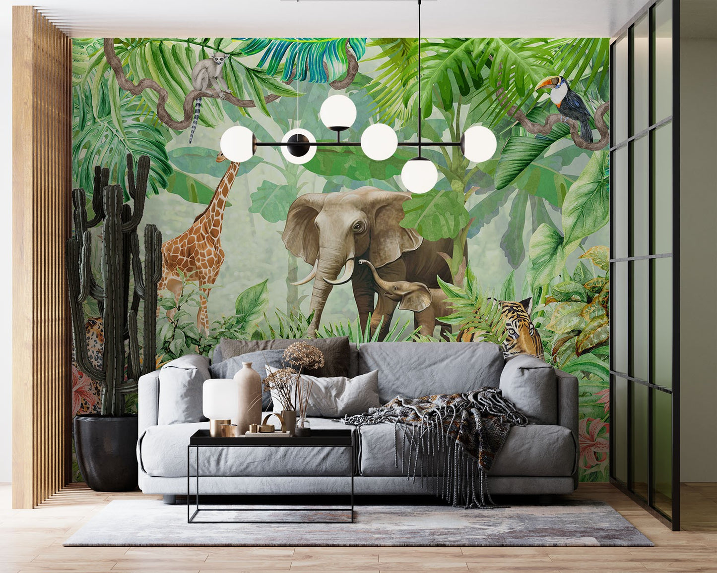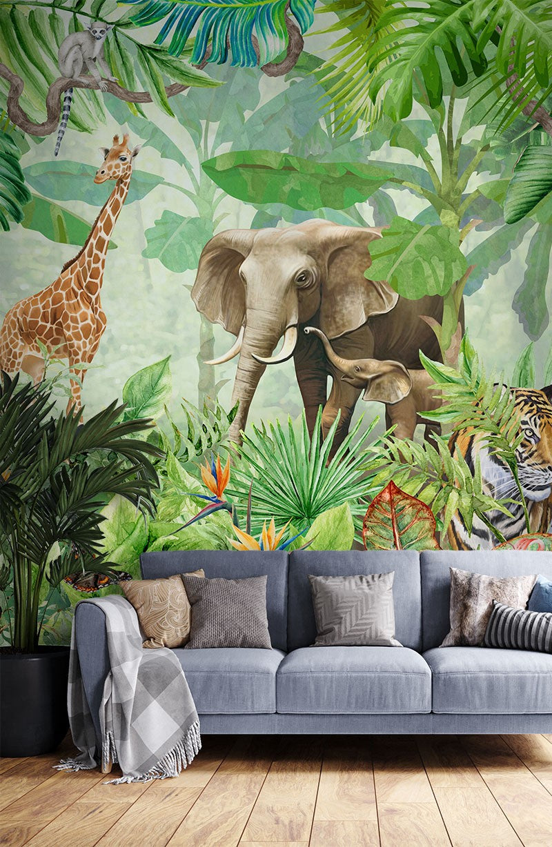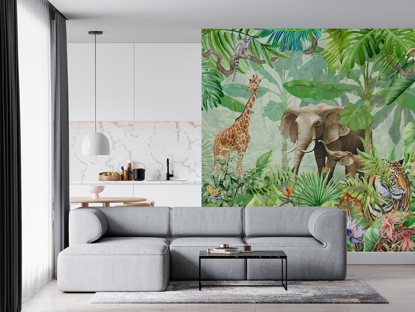 Giraffe Elephant Kids Animal Green Wallpaper Mural