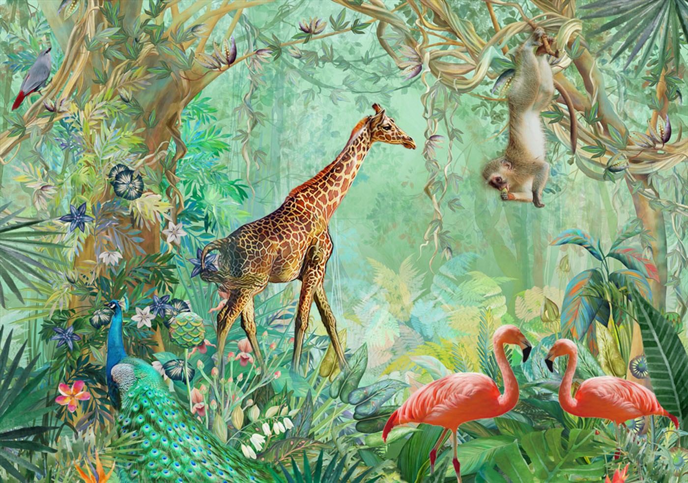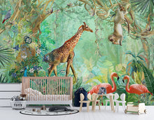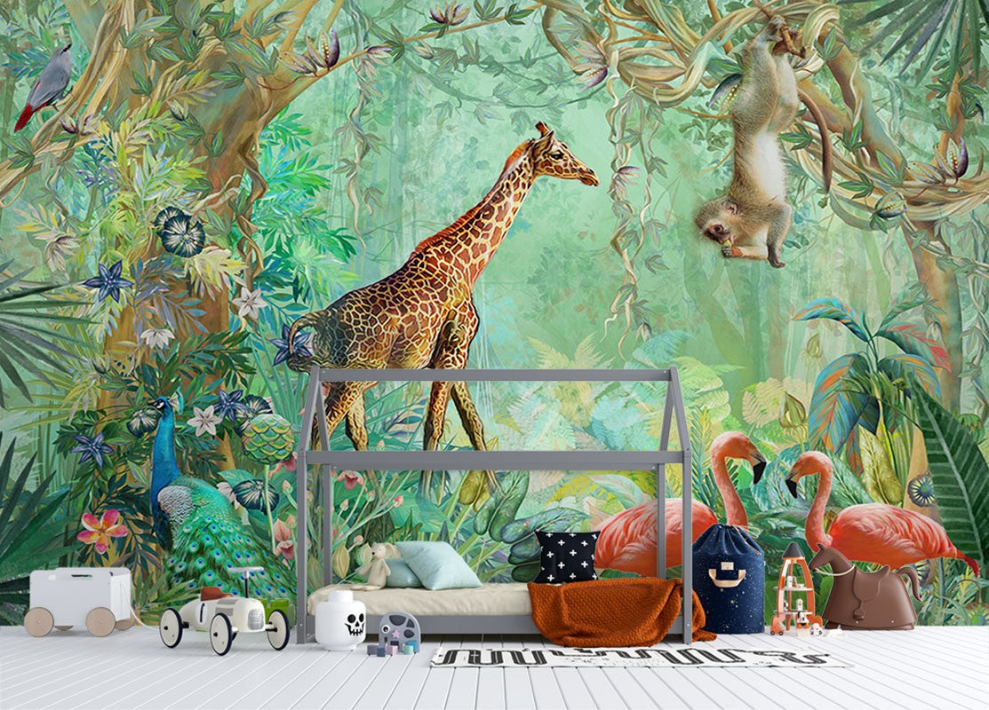 Giraffe Flamingo Kids Animal Green Wallpaper Mural,Self-Adhesive Peel And Stick 3D Wall Art,Australian Company Designer Wall Decor