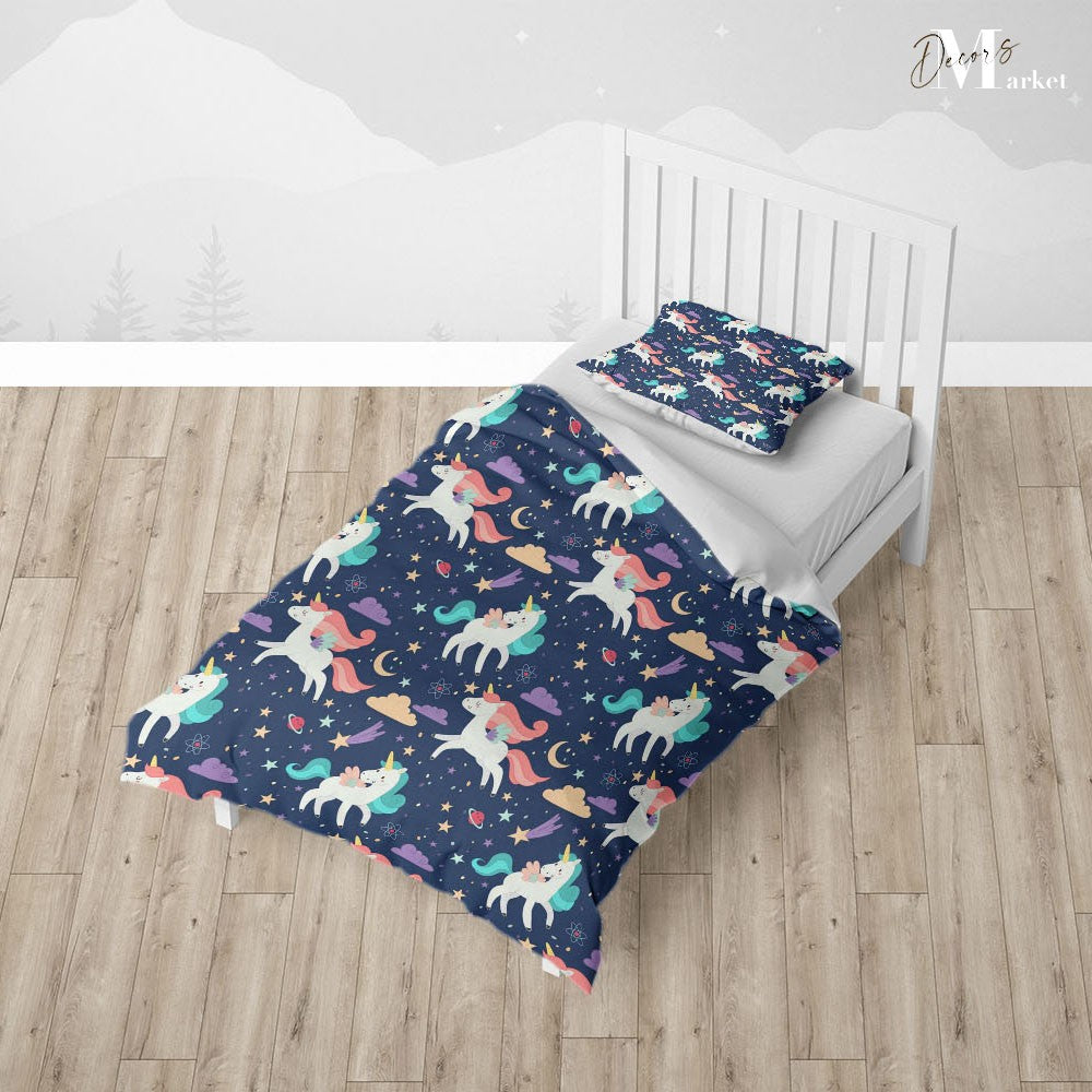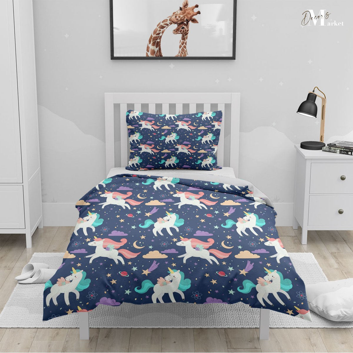 Girls Unicorn Stars Duvet Cover Set w Pillow Cover, Multicolour Kids Patterns 3D Quilt Cover, Single Double Queen King Size Doona Cover