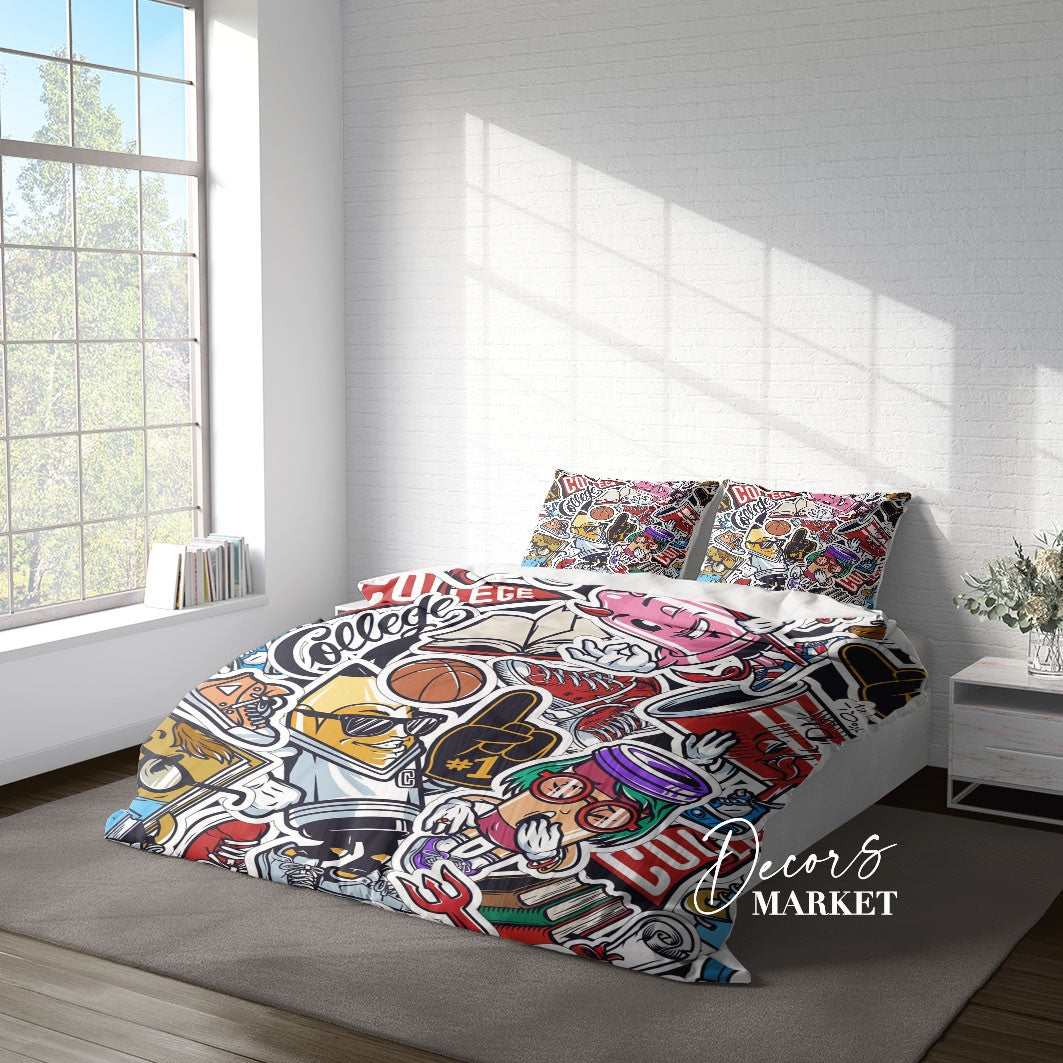 Stickers Duvet Cover Set w Pillowcases, Colorful Graffiti Sticker 3D Quilt Cover, 3pc Single Double Queen King Size Doona Cover
