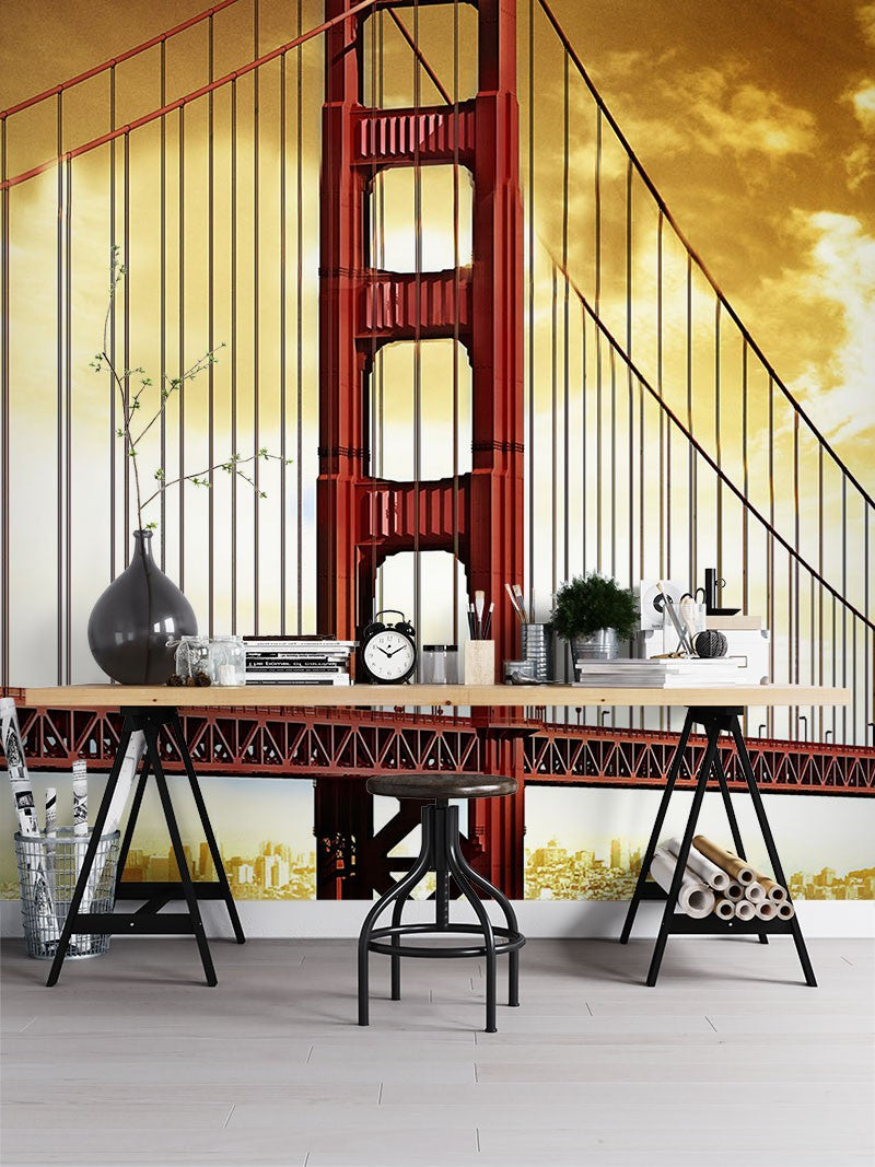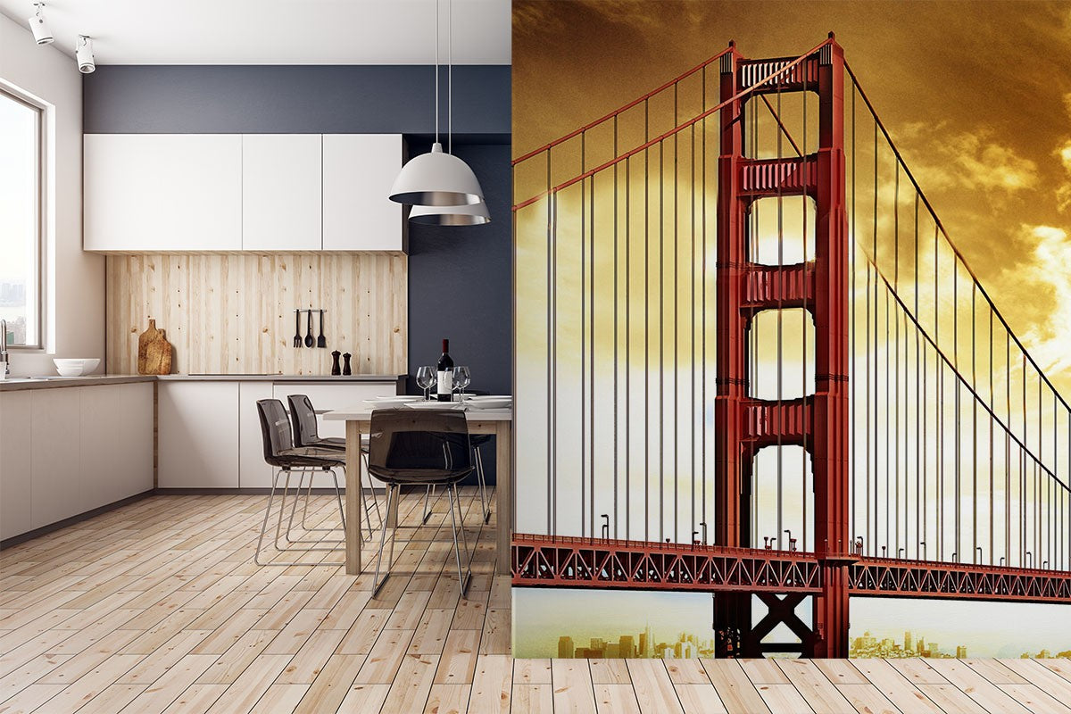 Golden Gate Bridge Landmarks Gold Wallpaper Mural,Self-Adhesive Peel And Stick 3D Wall Paper,Bedroom Designer Wall Decor