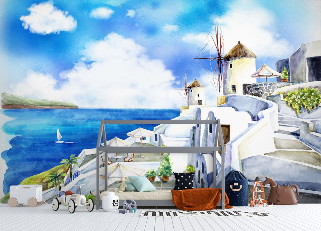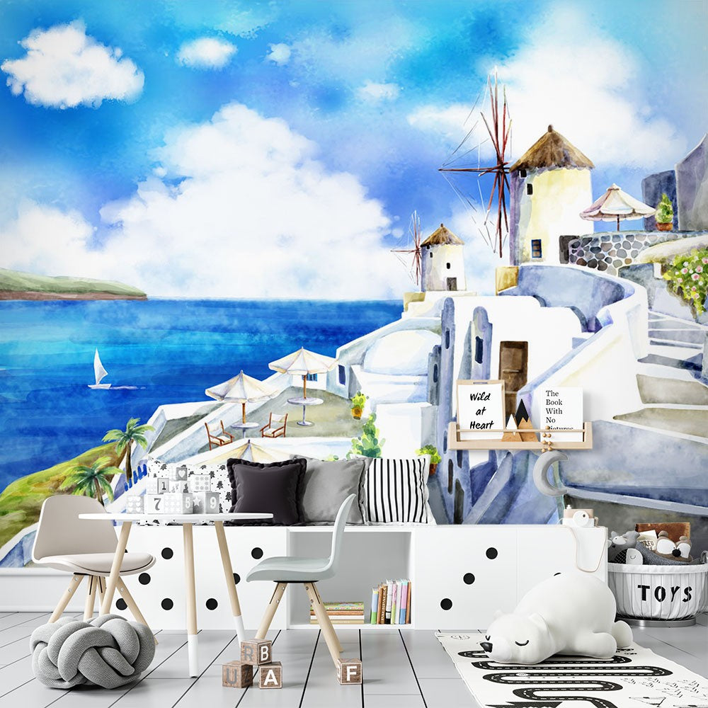 Greece Houses Kids Art For Kids Blue Wallpaper Mural,Self-Adhesive Peel And Stick 3D Wall Decal,Bedroom Removable Wall Decor