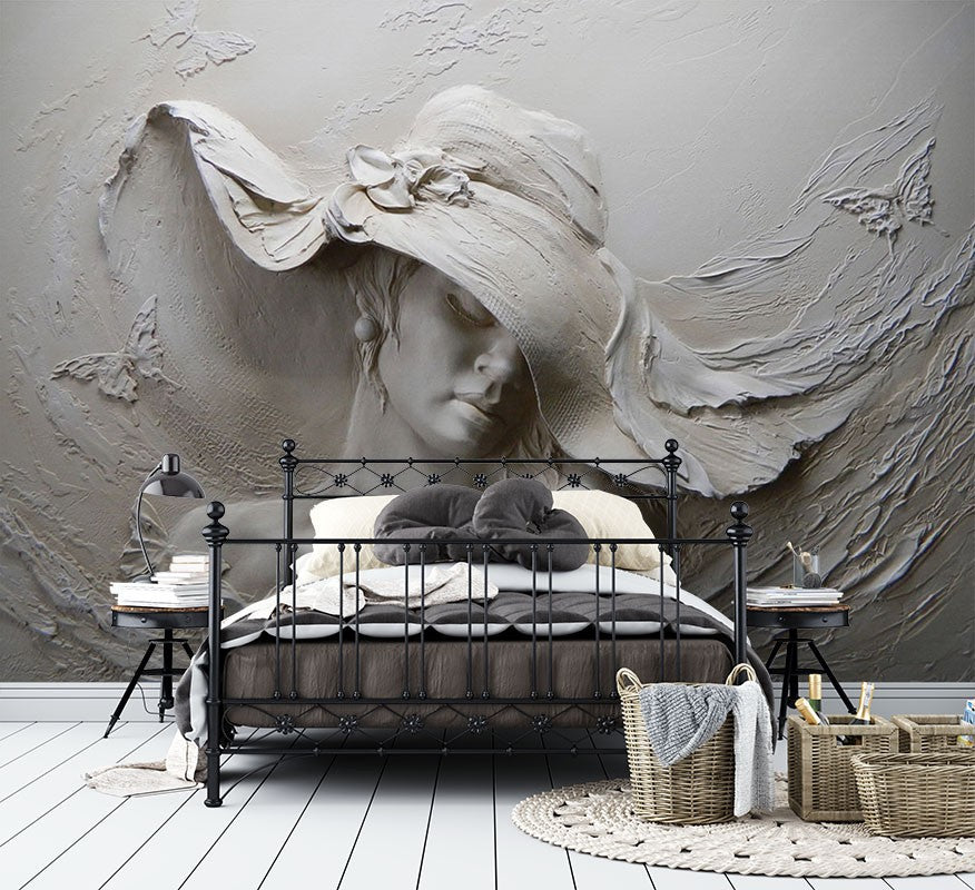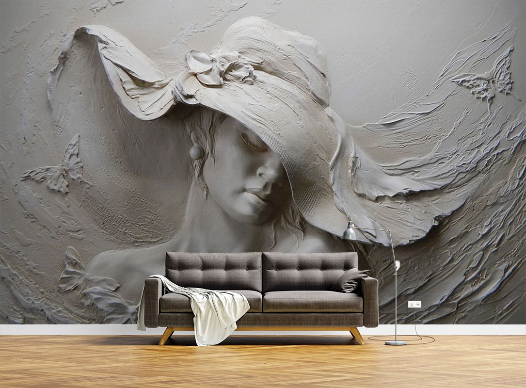 Hat Women Art 3D Creamy Wallpaper Mural,Self-Adhesive Peel And Stick 3D Wall Paper,Designer Removable Wall Decor
