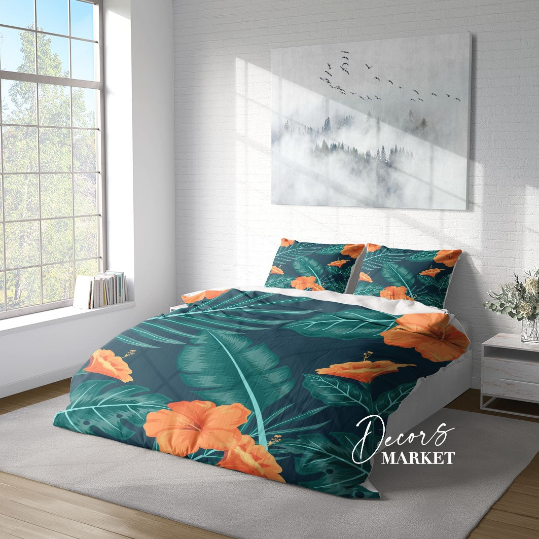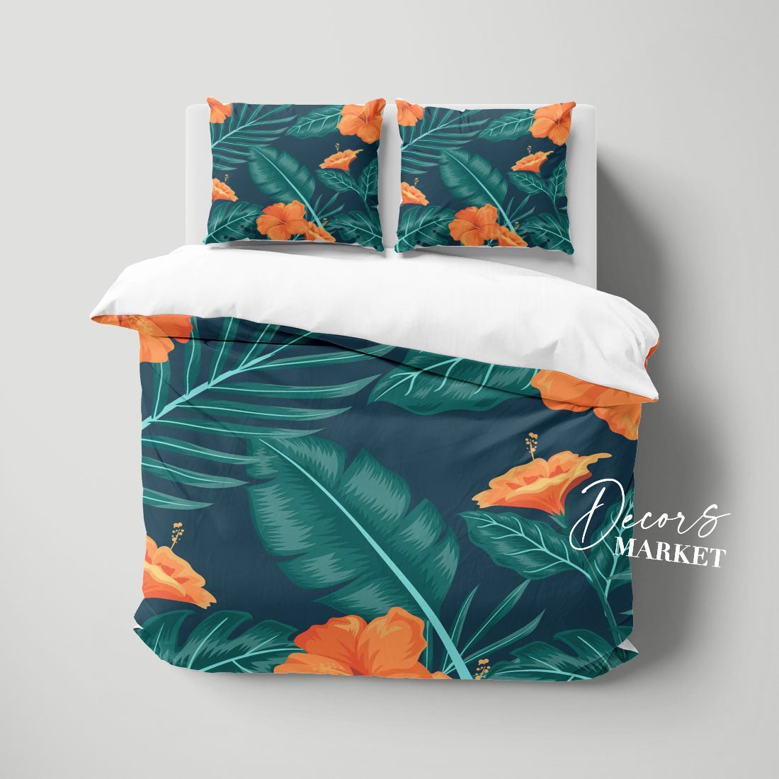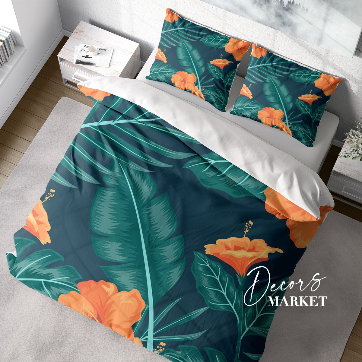 Hawaiian Hibiscus Leaf Duvet Cover Set w Pillowcases, Green Floral Patterns 3D Quilt Cover, 3pc Single Double Queen King Size Doona Cover
