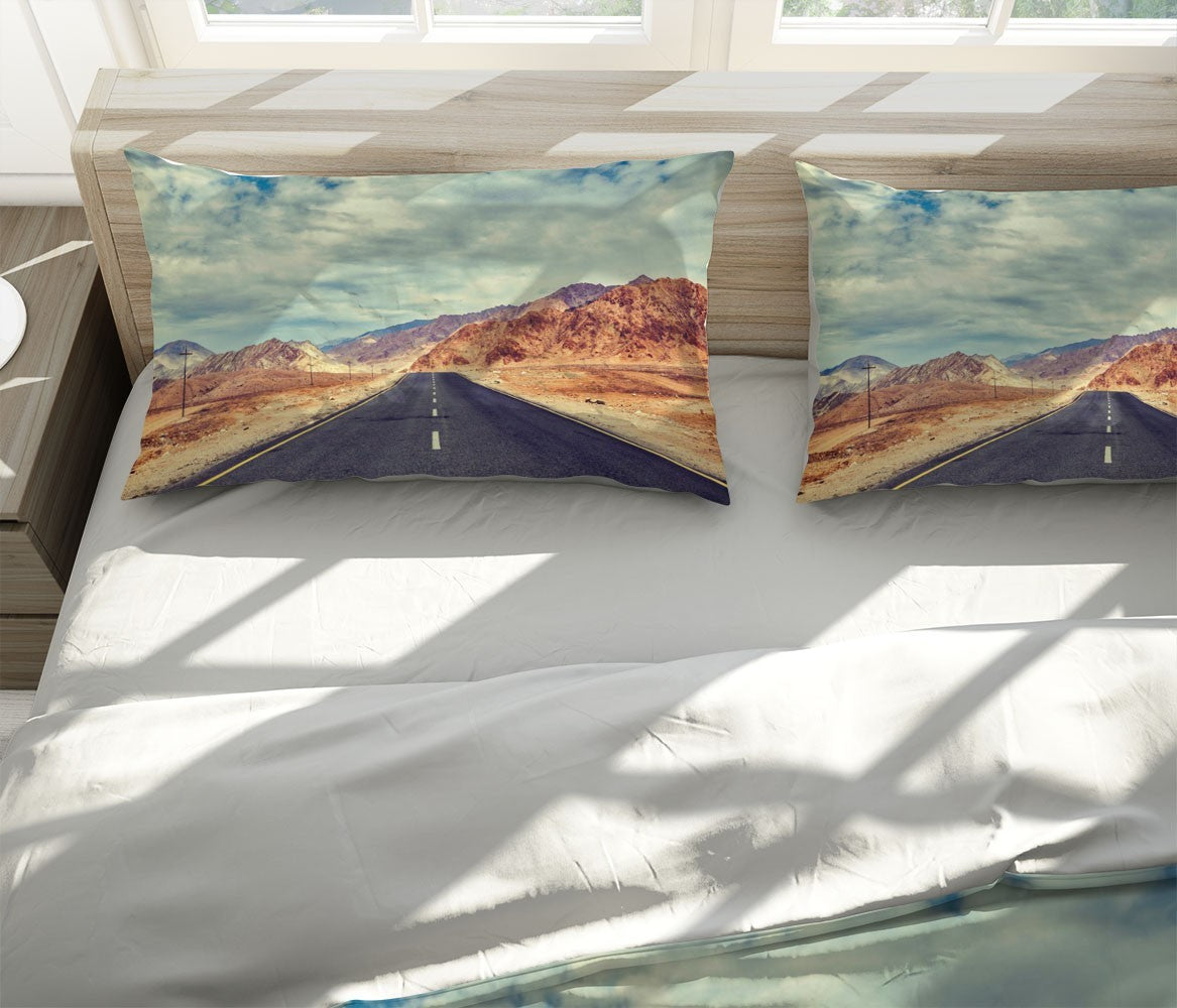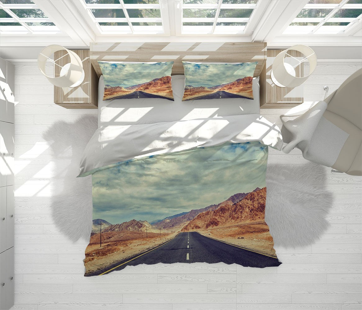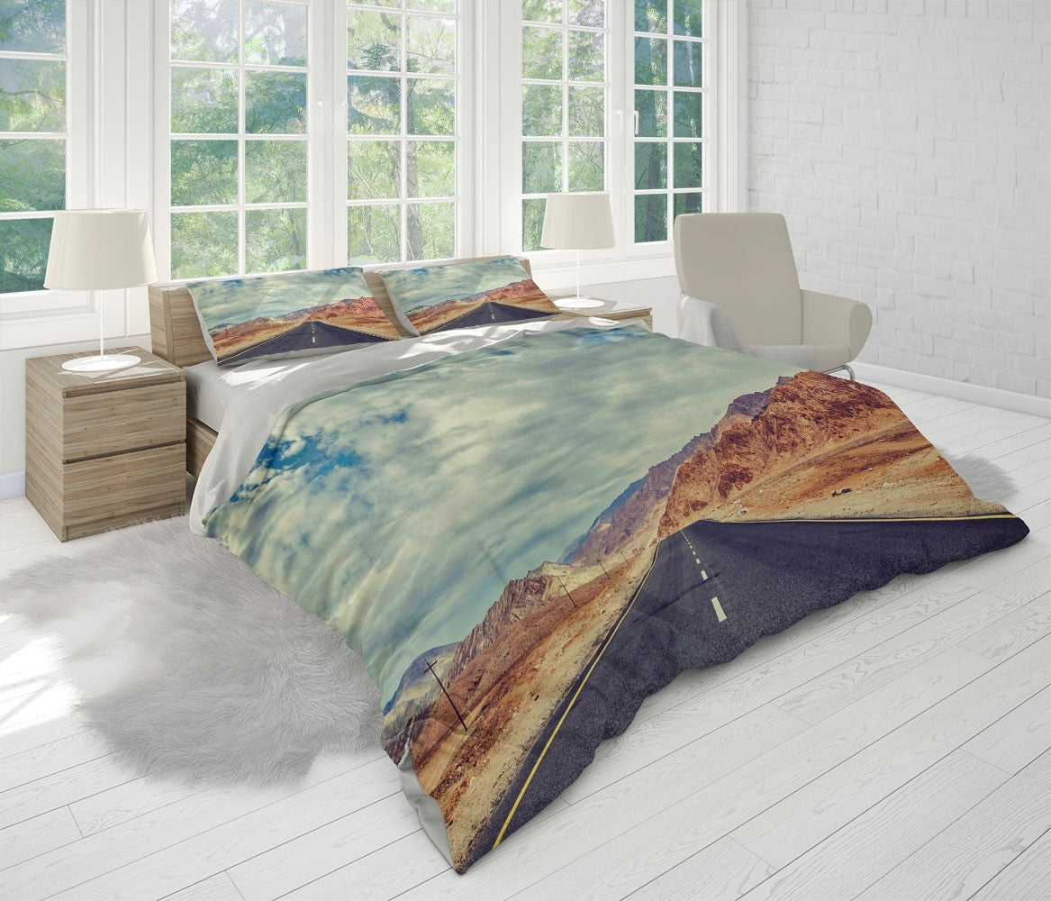 Highway Mountain Duvet Cover Set W Pillow Cover, Brown Nature Landscape 3D Quilt Cover, Single Double Queen King Size Doona Cover