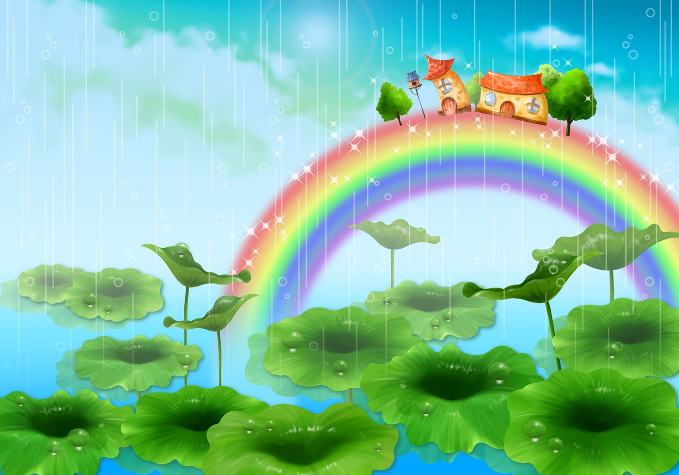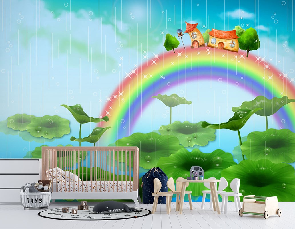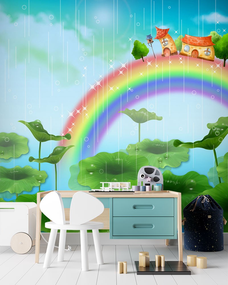 Houses Rainbow Kids Fantasy Green Wallpaper Mural,Self-Adhesive Peel And Stick 3D Wall Art,Designer Removable Wall Decor