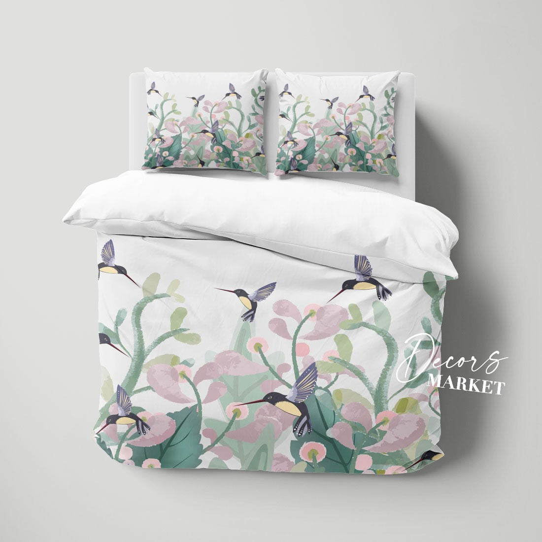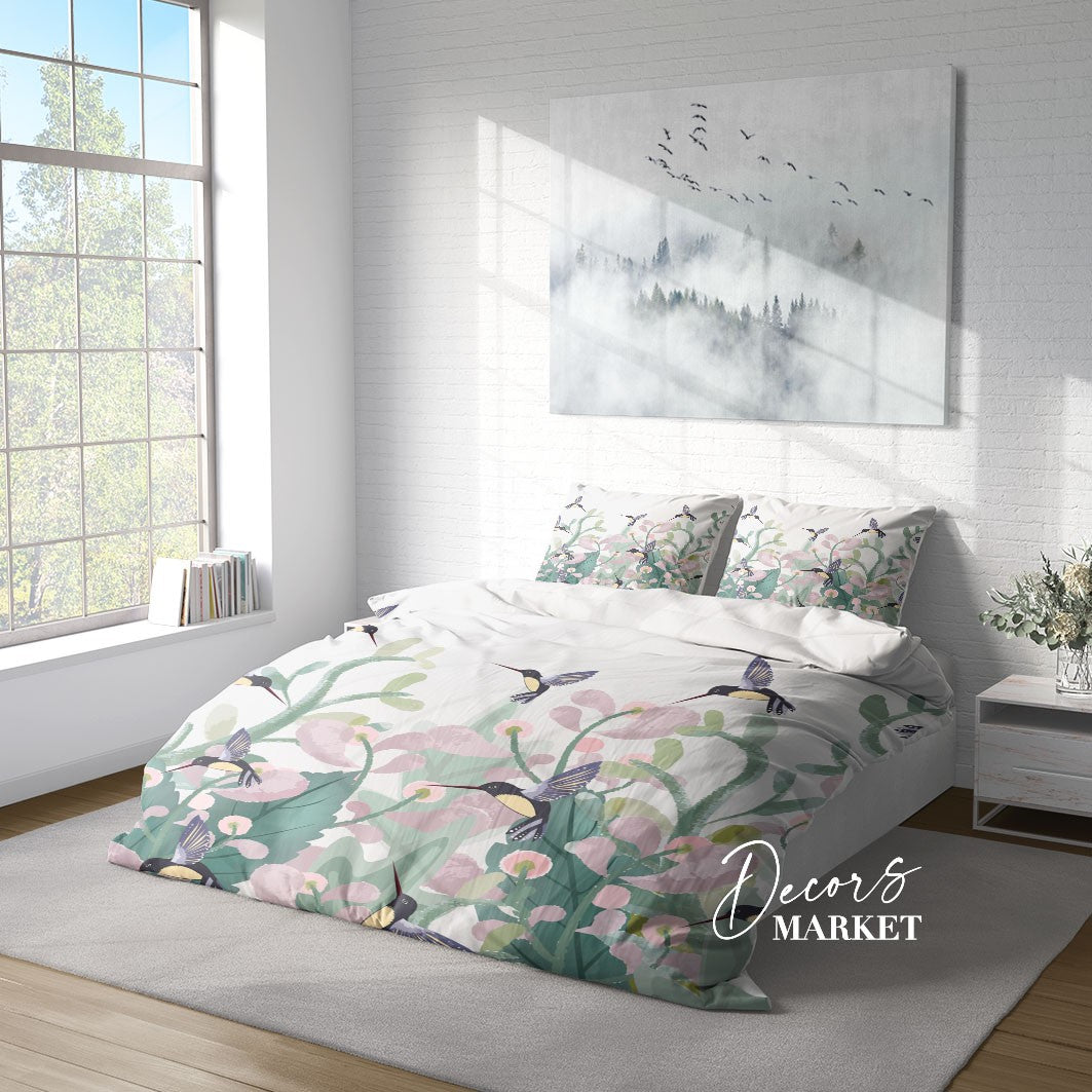 Hummingbird Duvet Cover Set w Pillowcases, Pastel Green Floral Flowers Birds 3D Quilt Cover, 3pc Single Double Queen King Size Doona Cover