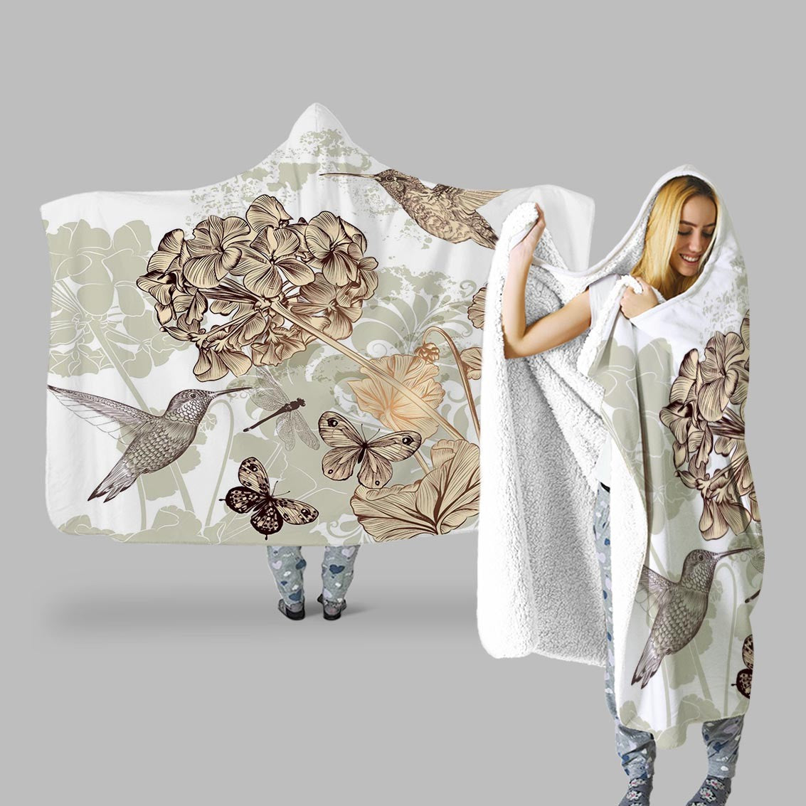 Hummingbird Sketch Bush Floral Flowers Gold Personalized Hooded Throw Blanket Fleece Hoodie Cape
