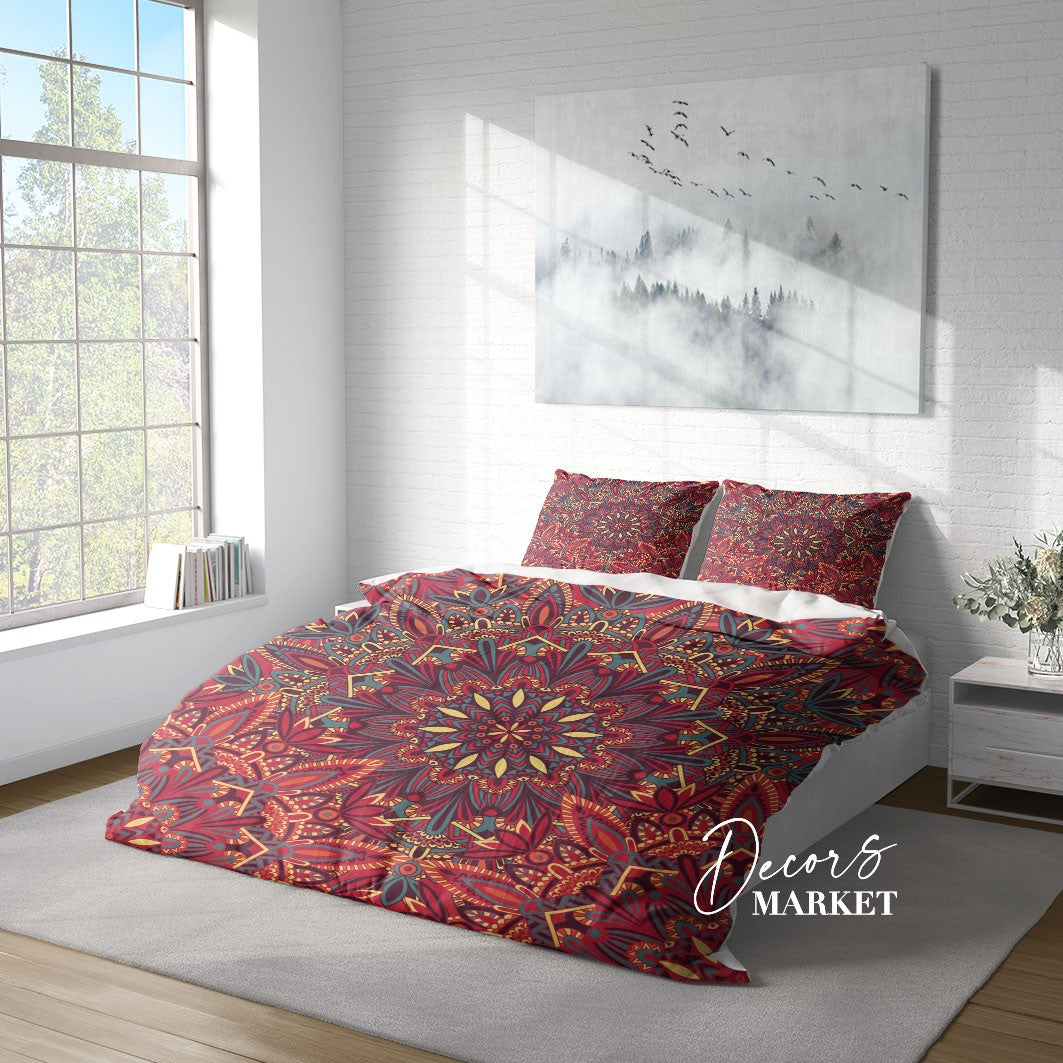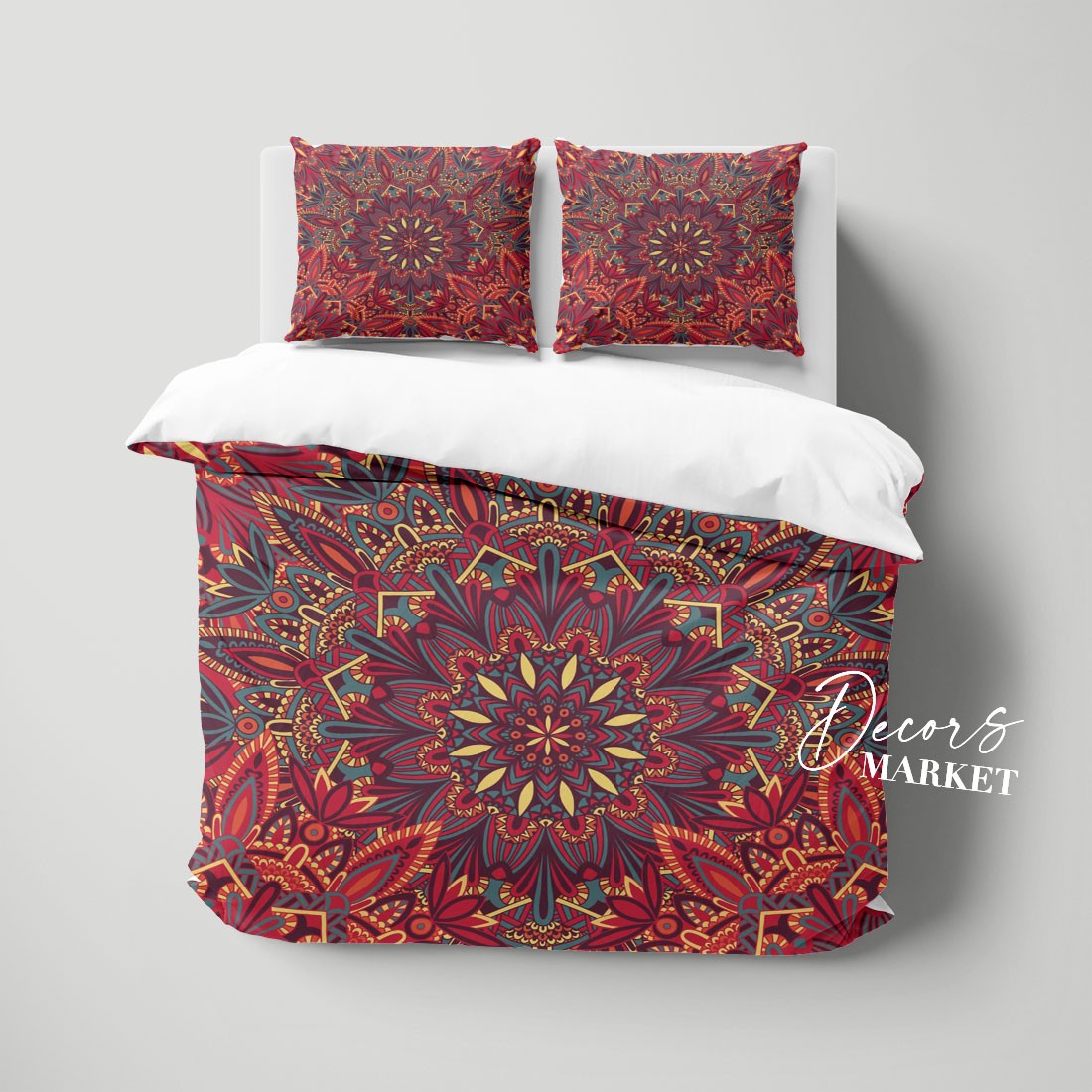 Indian Mandala Duvet Cover Set w Pillowcases, Red Symmetrical Floral Patterns 3D Quilt Cover, 3pc Single Double Queen King Size Doona Cover