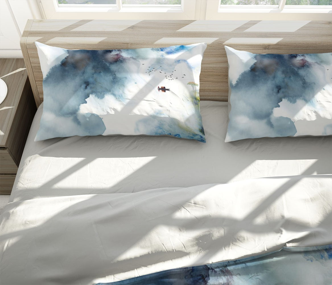 Ink Landscape Duvet Cover Set W Pillow Cover, Blue Art Chinoiserie 3D Quilt Cover, Single Double Queen King Size Doona Cover