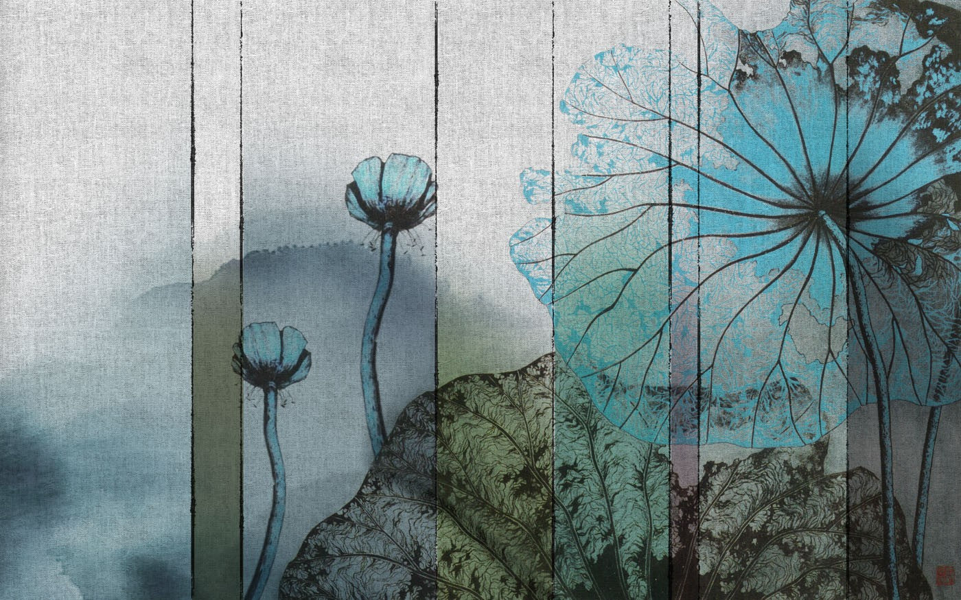 Ink Lotus Art Chinoiserie Blue Wallpaper Mural,Self-Adhesive Peel And Stick 3D Wall Mural,Australian Company Designer Wall Decor