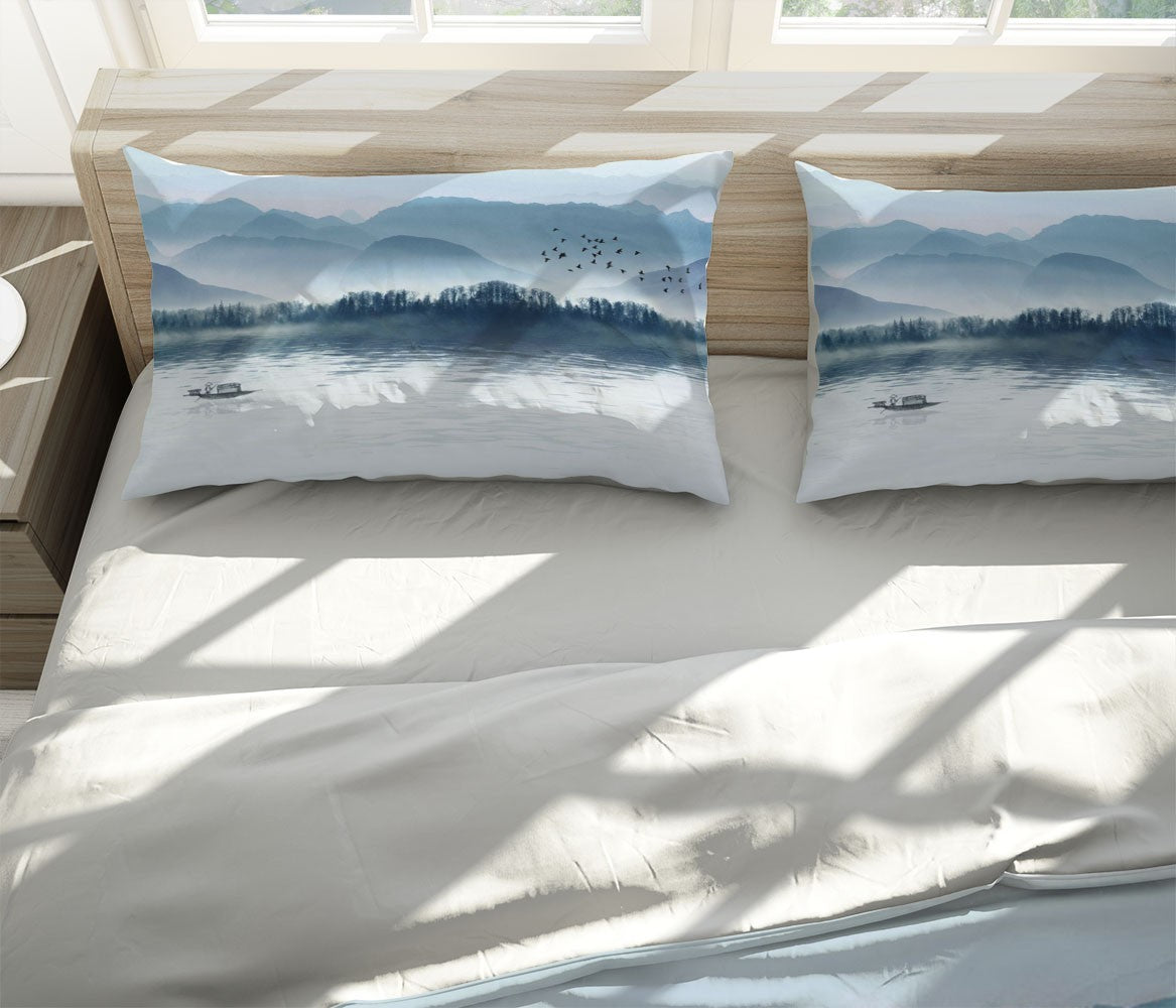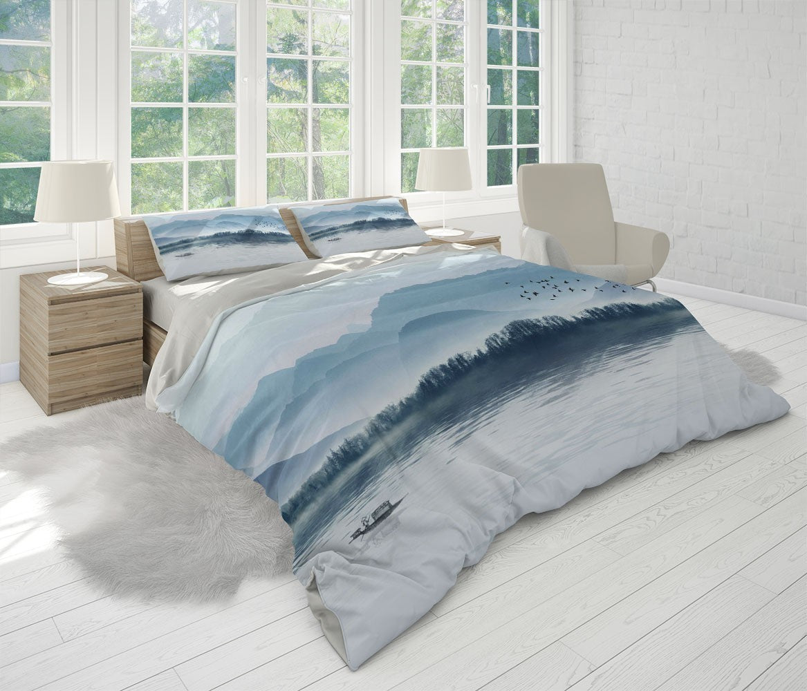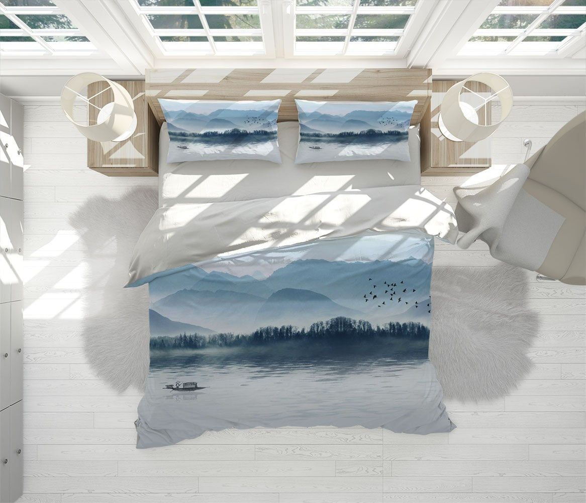 Ink Painting Duvet Cover Set W Pillow Cover, Blue Art Chinoiserie 3D Quilt Cover, Single Double Queen King Size Doona Cover