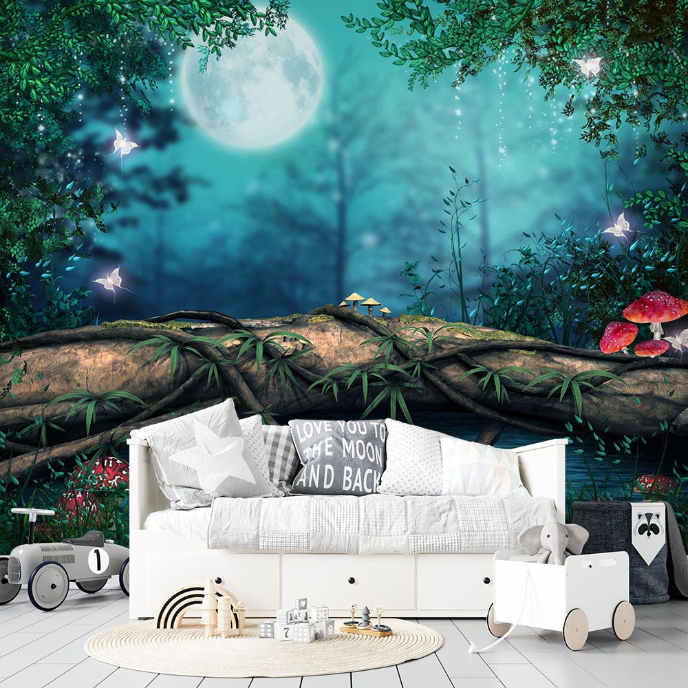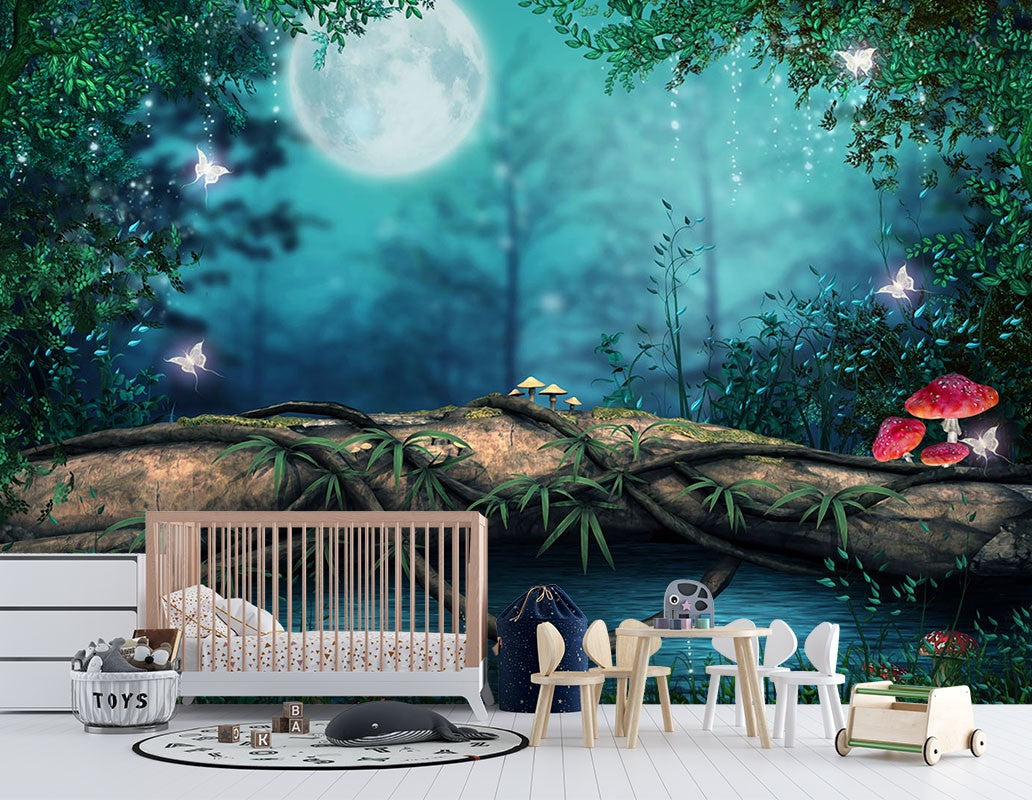 Jungle Mushrooms Kids Space Green Wallpaper Mural,Self-Adhesive Peel And Stick 3D Wall Paper,Bedroom Removable Wall Decor