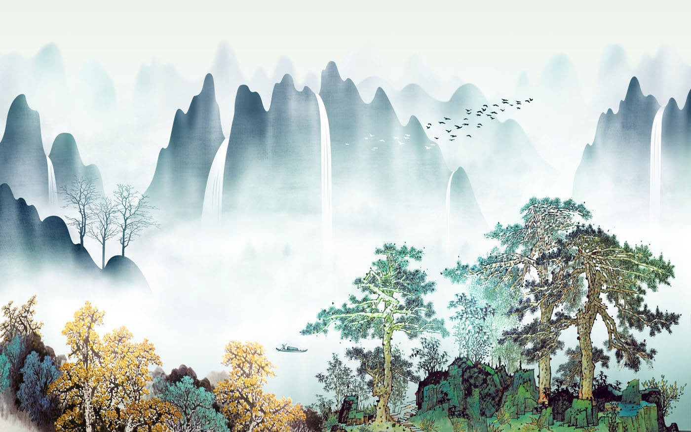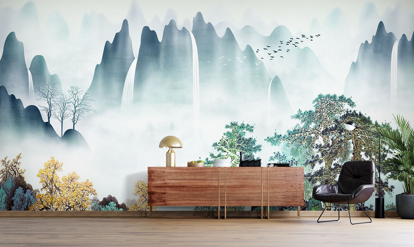 Landscape Art Chinoiserie Green Wallpaper Mural,Self-Adhesive Peel And Stick 3D Wall Decor,Removable Designer Wall Decor