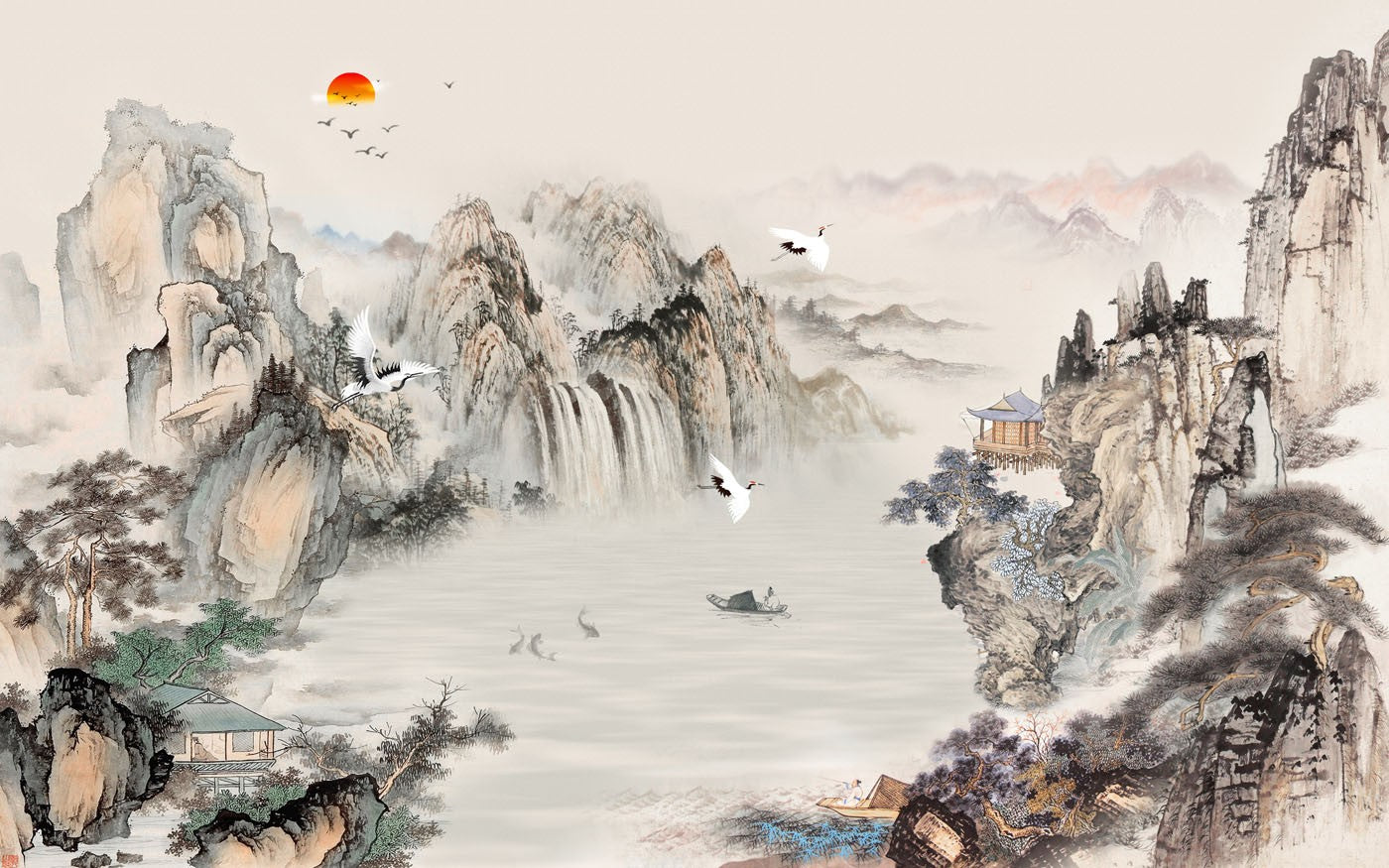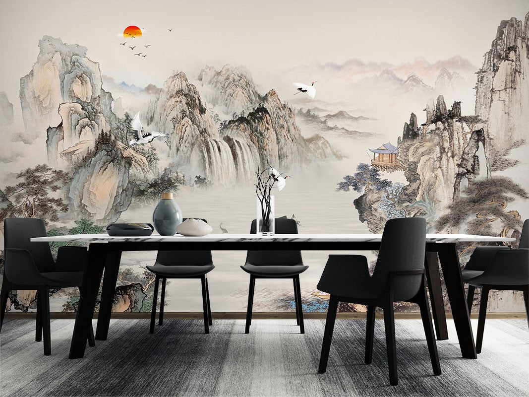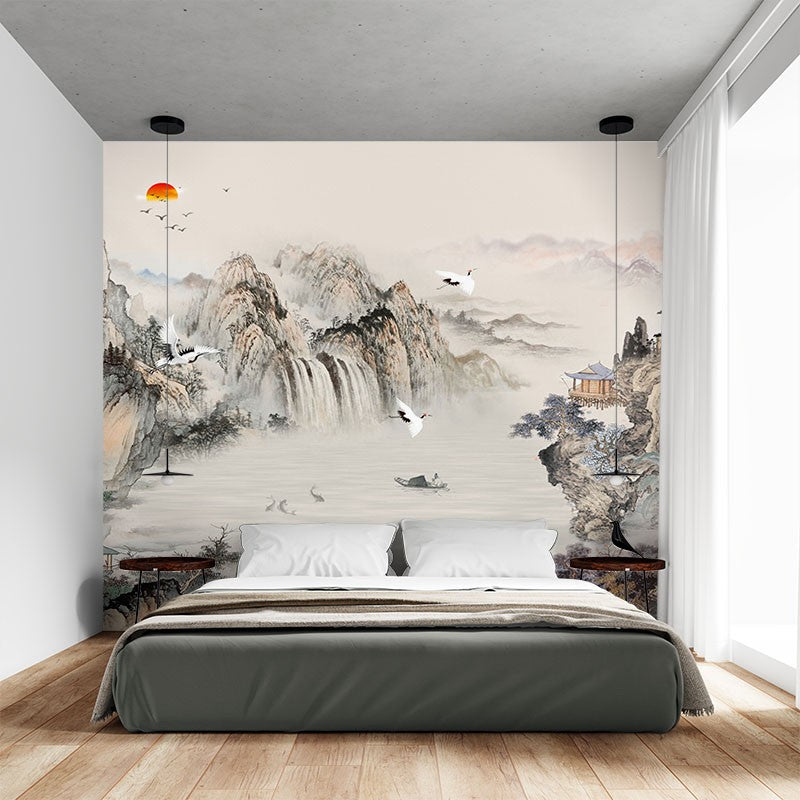 Landscape Crane Art Chinoiserie Neutral Wallpaper Mural,Self-Adhesive Peel And Stick 3D Wall Art,Designer Removable Wall Decor