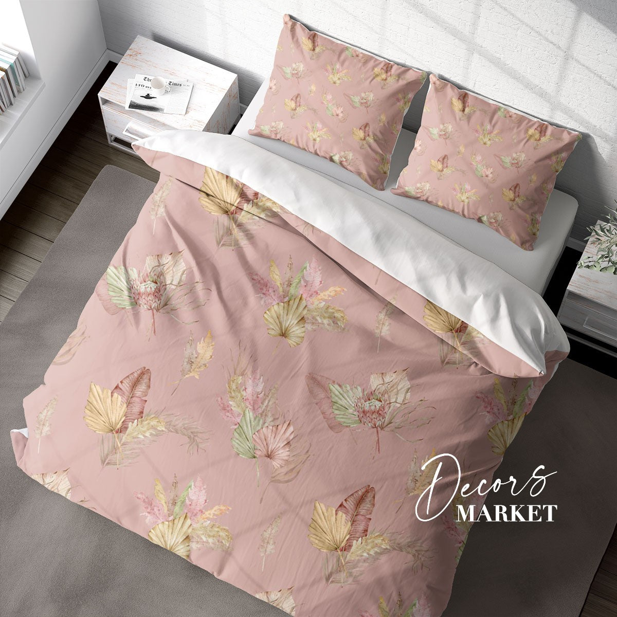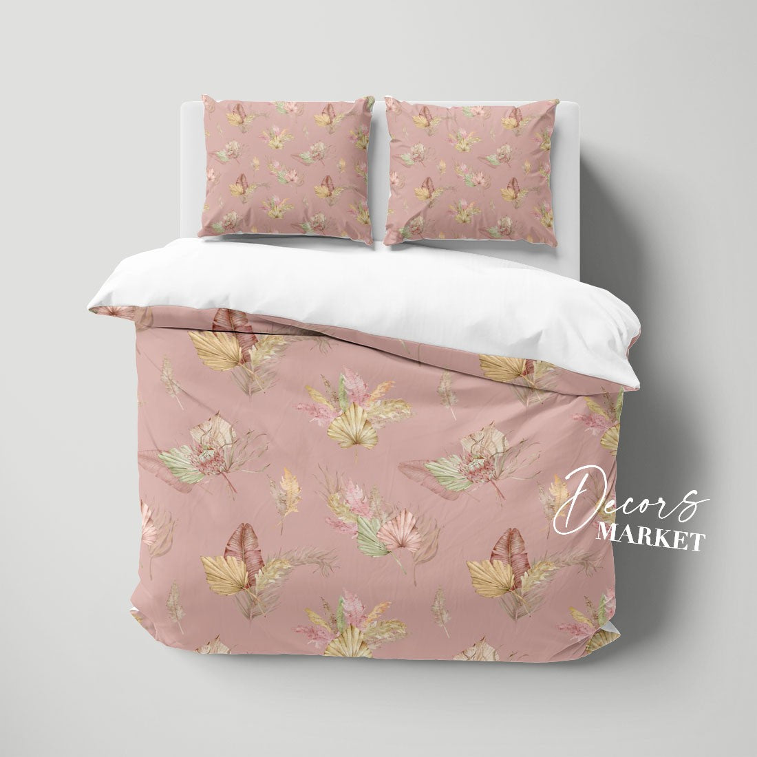 Leaf Flower Watercolor Duvet Cover Set w Pillowcases, Pink Floral Patterns 3D Quilt Cover, 3pc Single Double Queen King Size Doona Cover