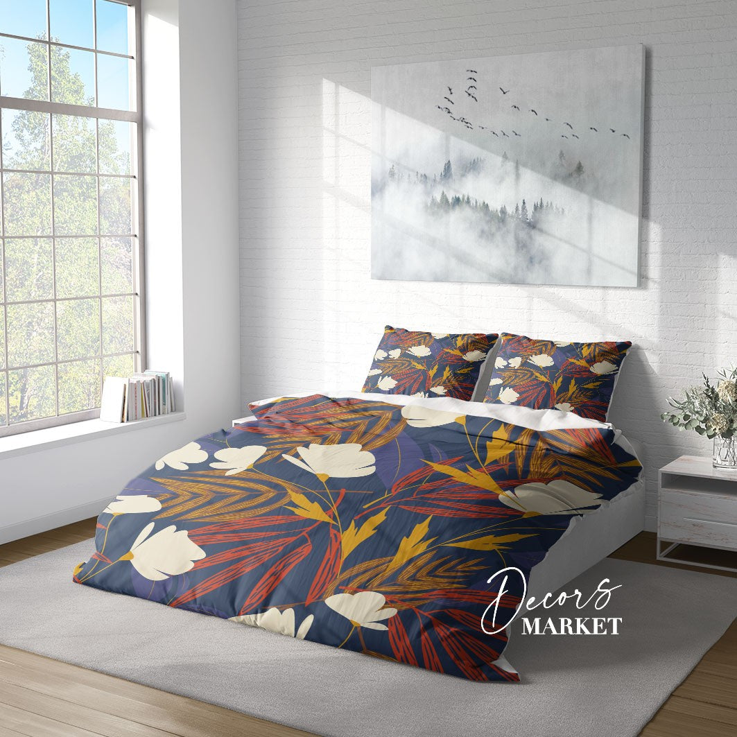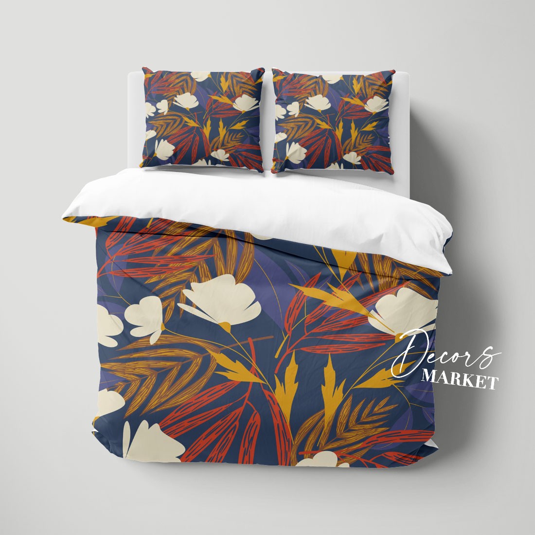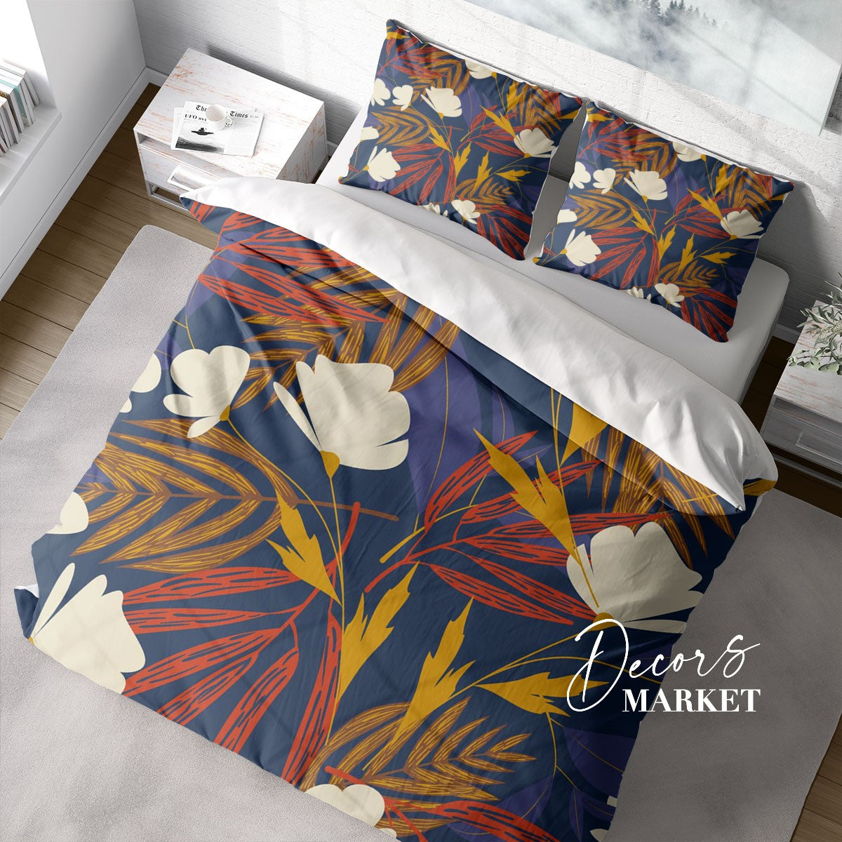 Hand Drawn Leaf and Flower Duvet Cover Set w Pillowcases, Blue Floral Patterns 3D Quilt Cover, 3pc Single Double Queen King Size Doona Cover