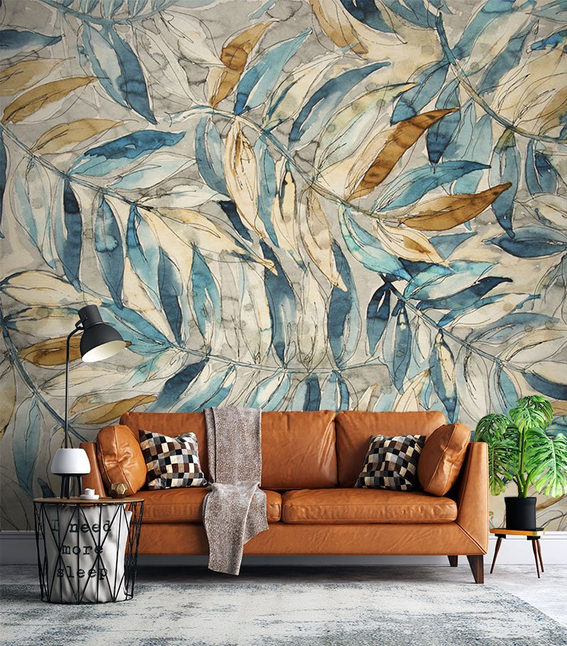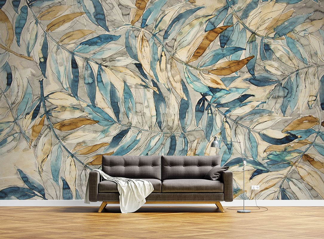 Leaves Floral Patterns Blue Wallpaper Mural,Self-Adhesive Peel And Stick 3D Wall Paper,Designer Australian Company Wall Decor