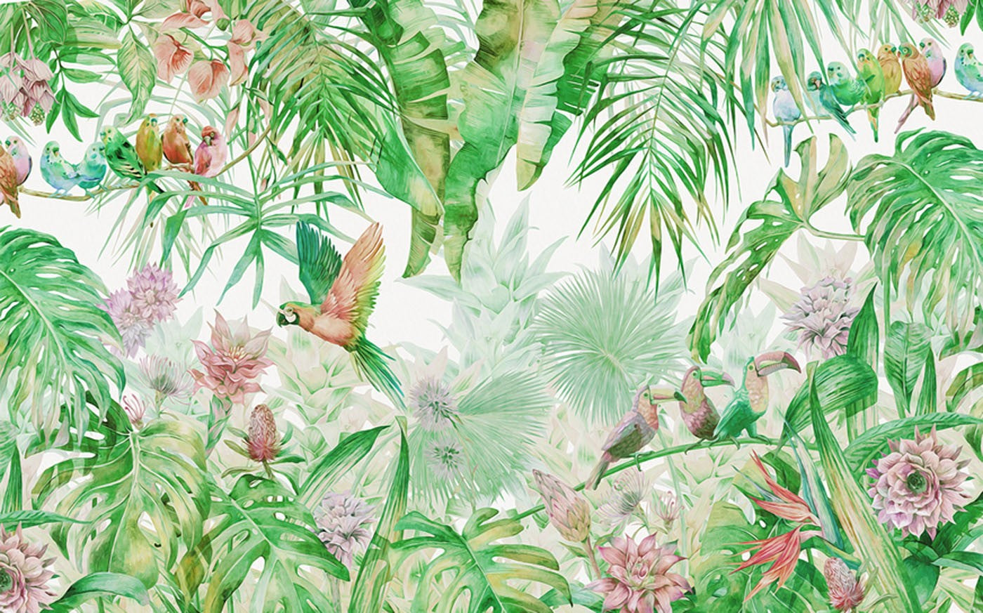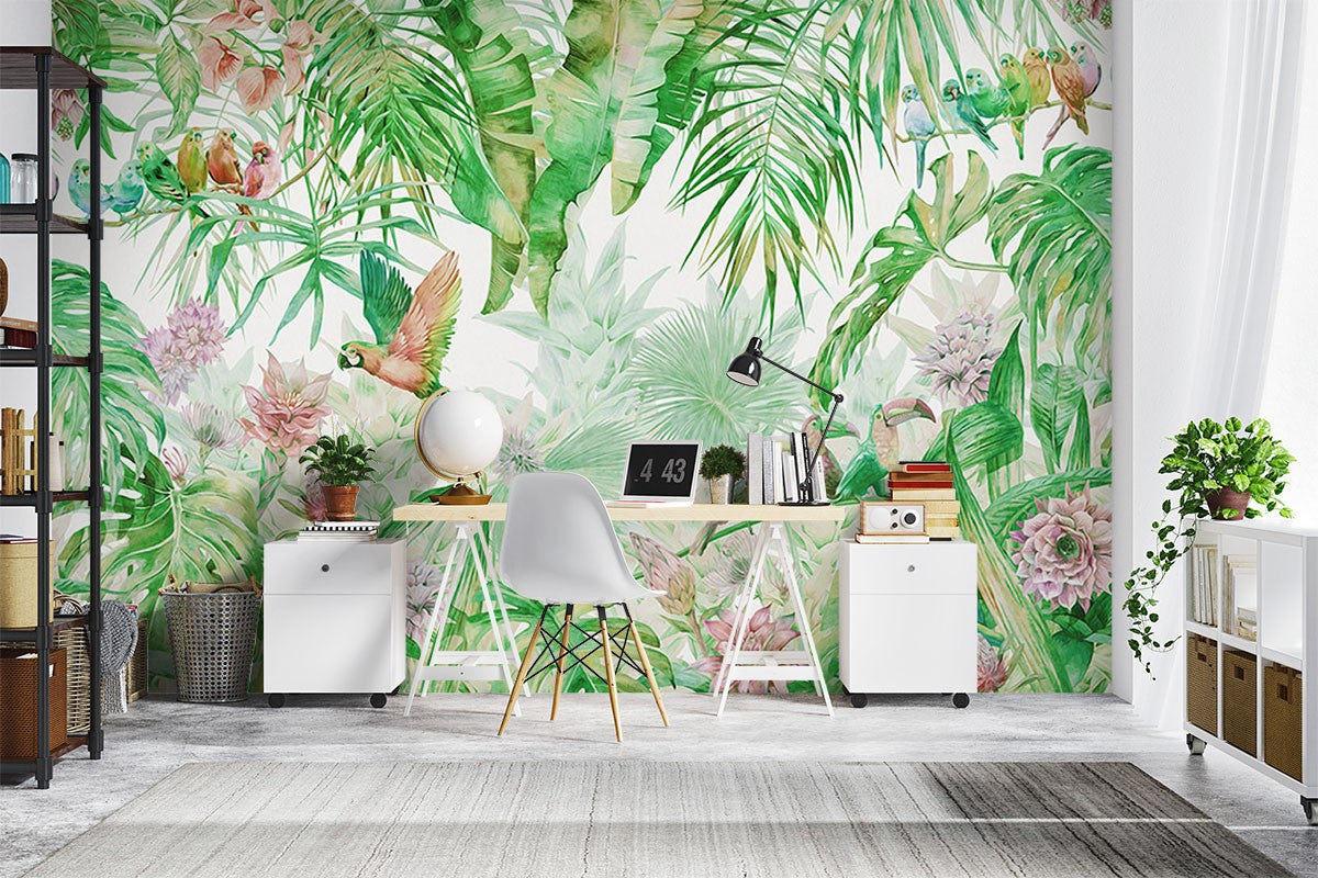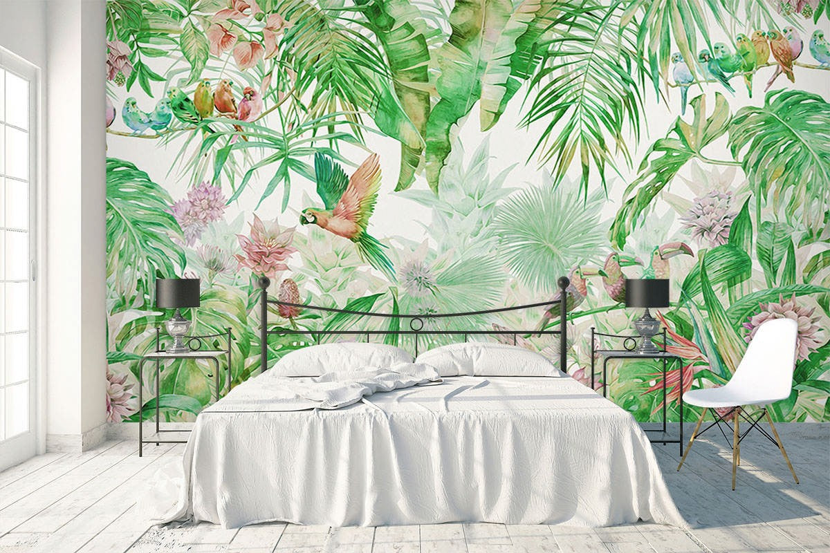 Leaves Parrots Floral Green Wallpaper Mural,Self-Adhesive Peel And Stick 3D Wall Decal,Bedroom Designer Wall Decor