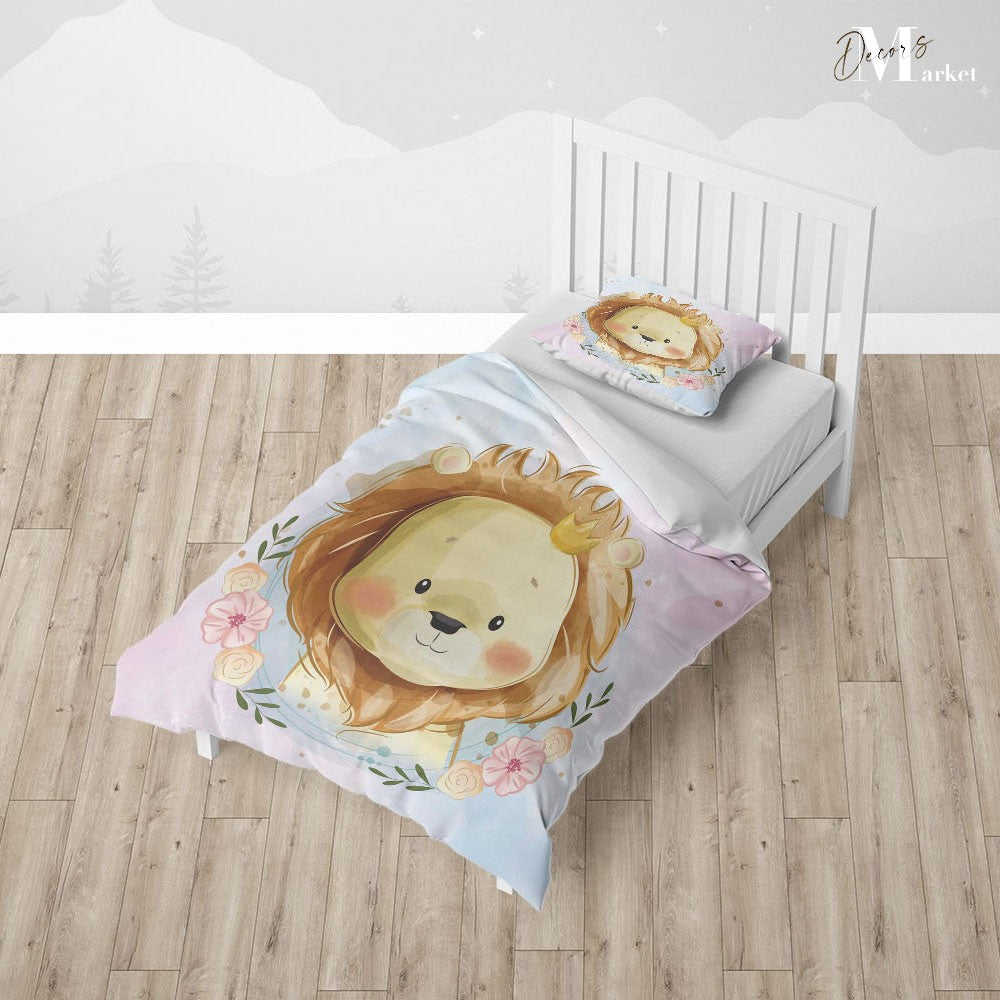 Lion Profile Cute Duvet Cover Set w Pillow Cover, Gold Kids Cartoon 3D Quilt Cover, Single Double Queen King Size Doona Cover