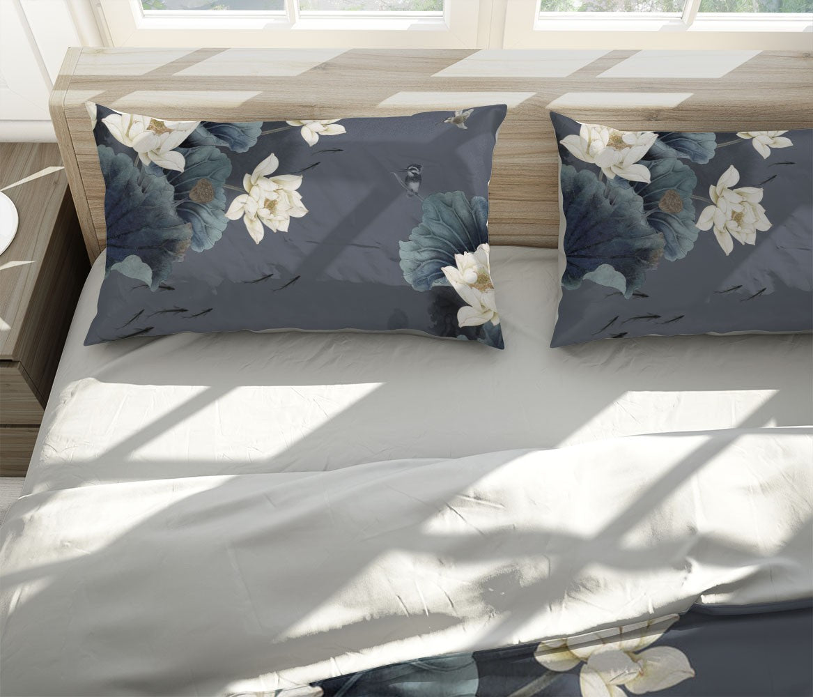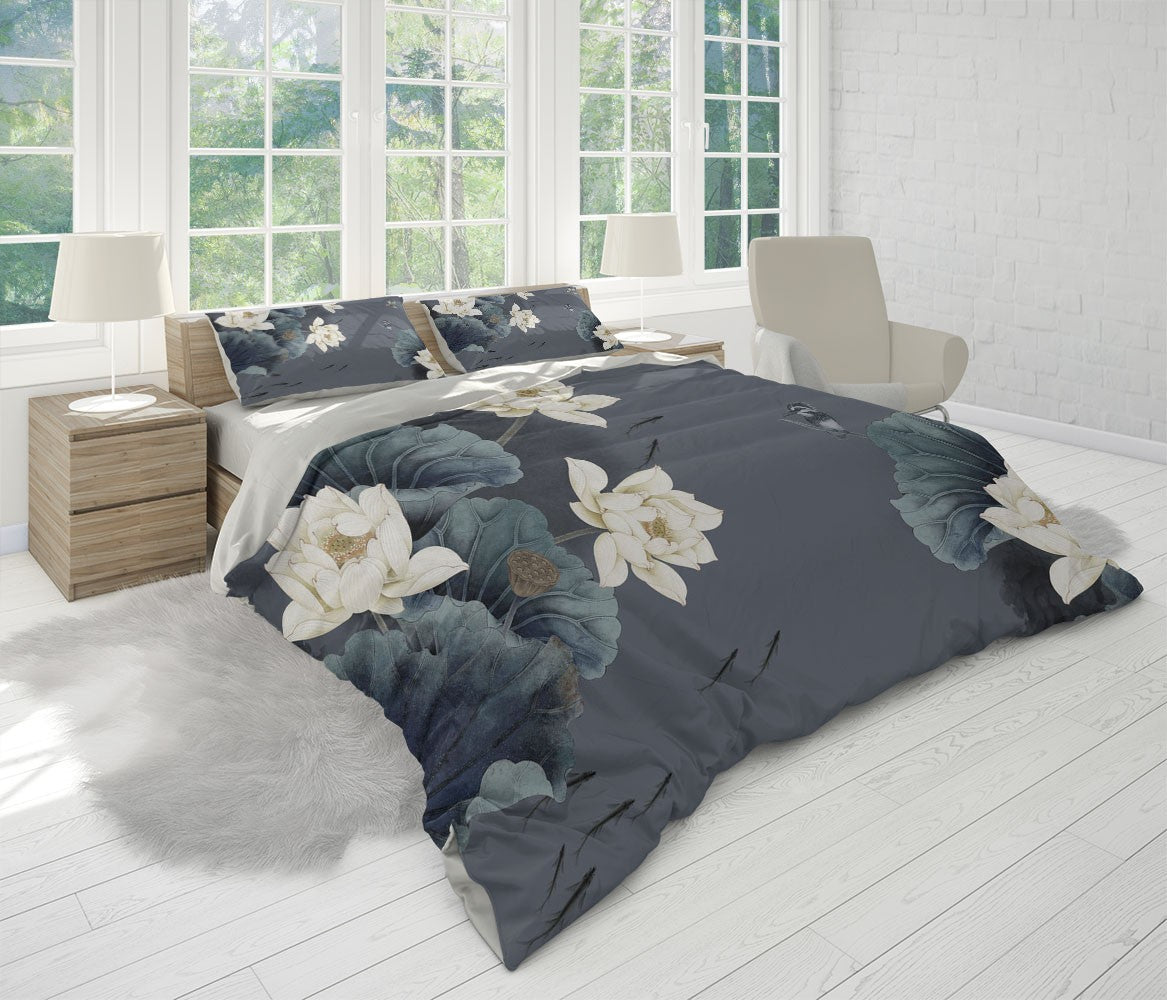 Lotus Fish Floral Flowers Black 3D Duvet Cover Set W Pillow Cover, Single Double Queen King Size, Printed Cotton Quilt Doona Cover 3 Pcs