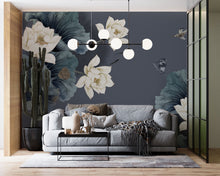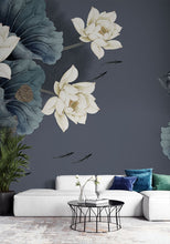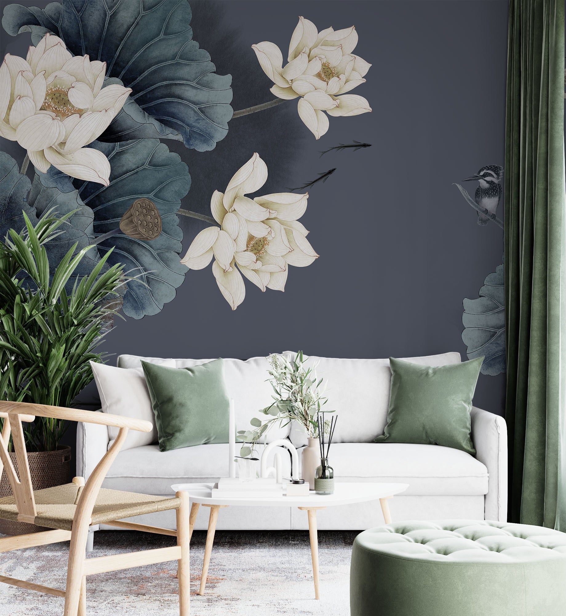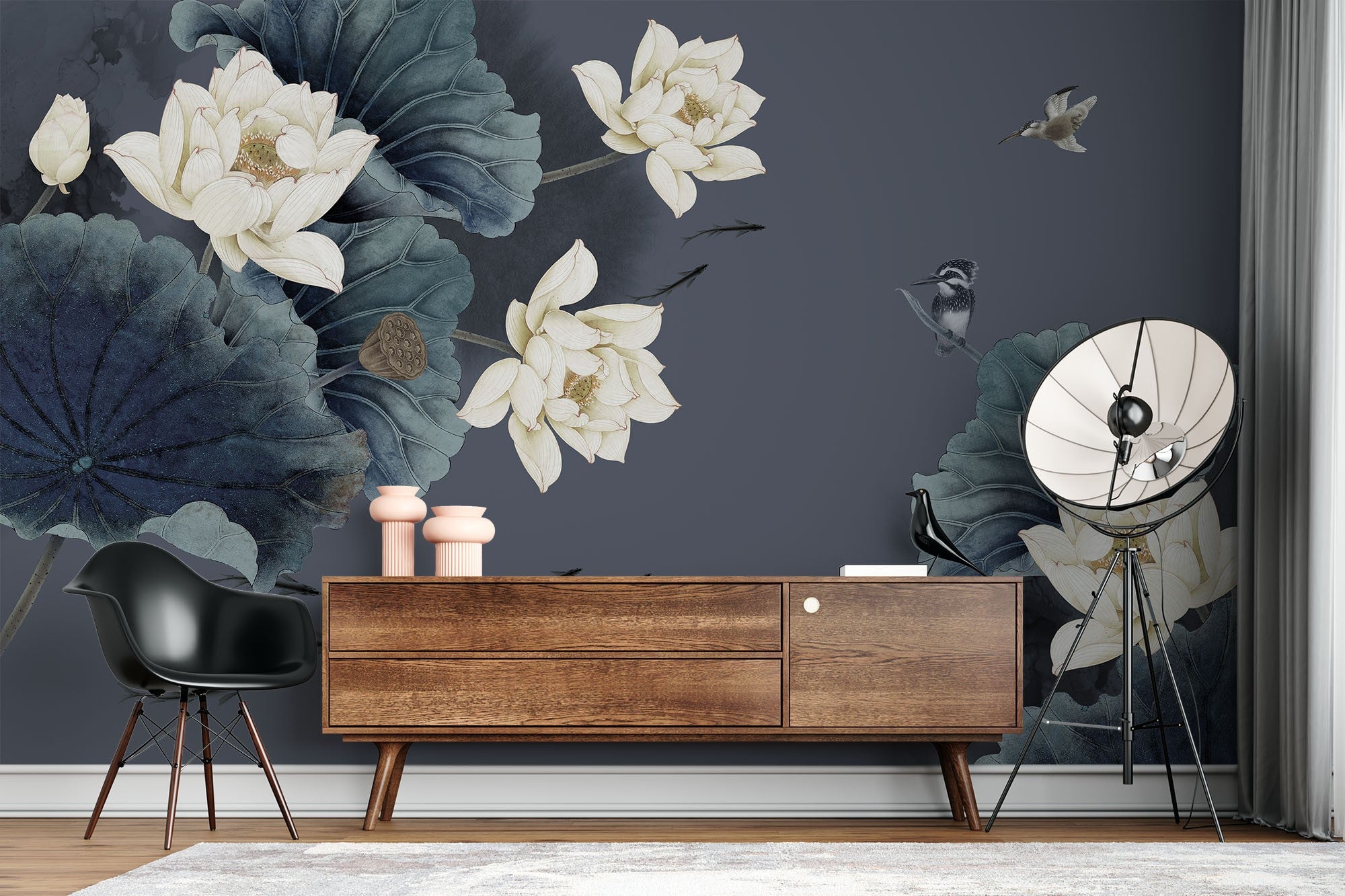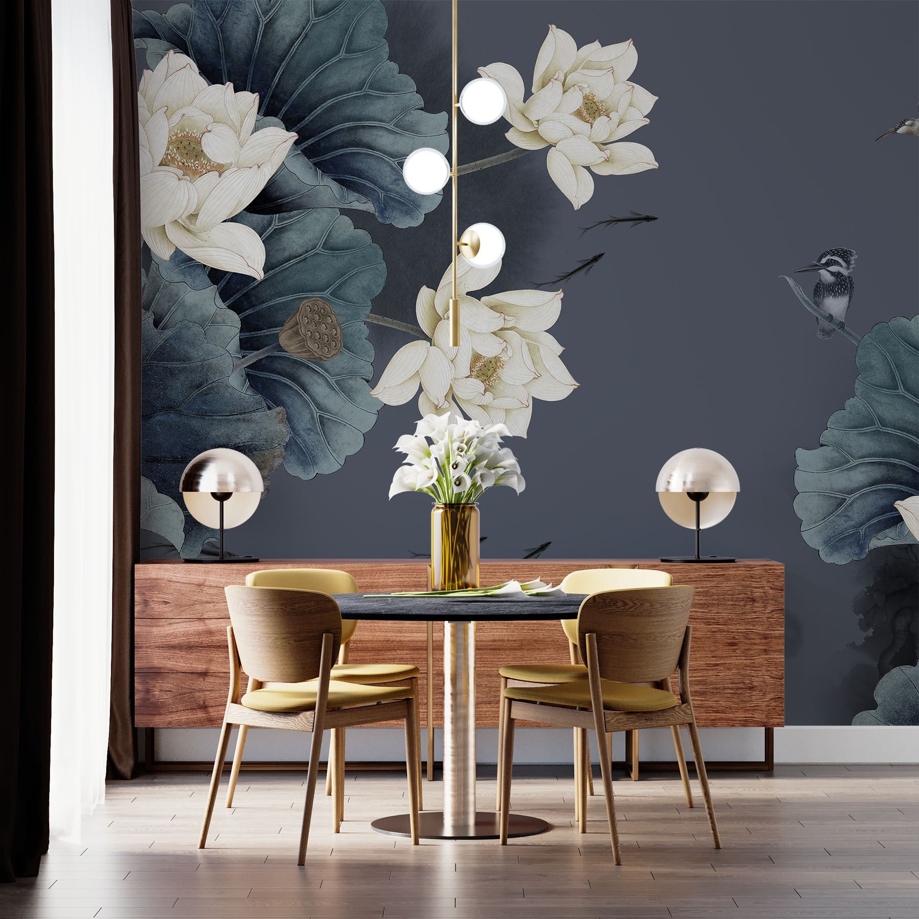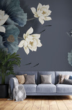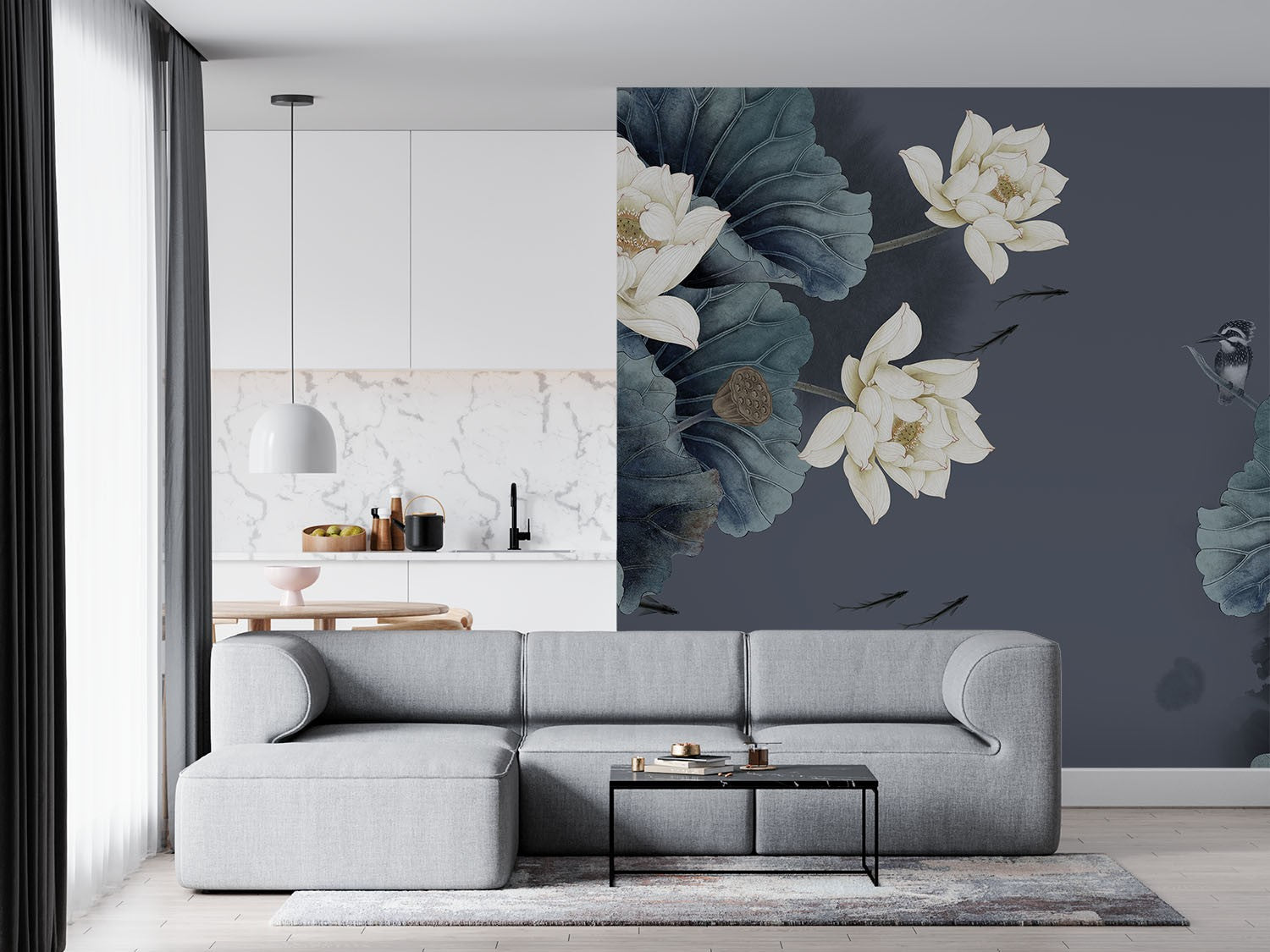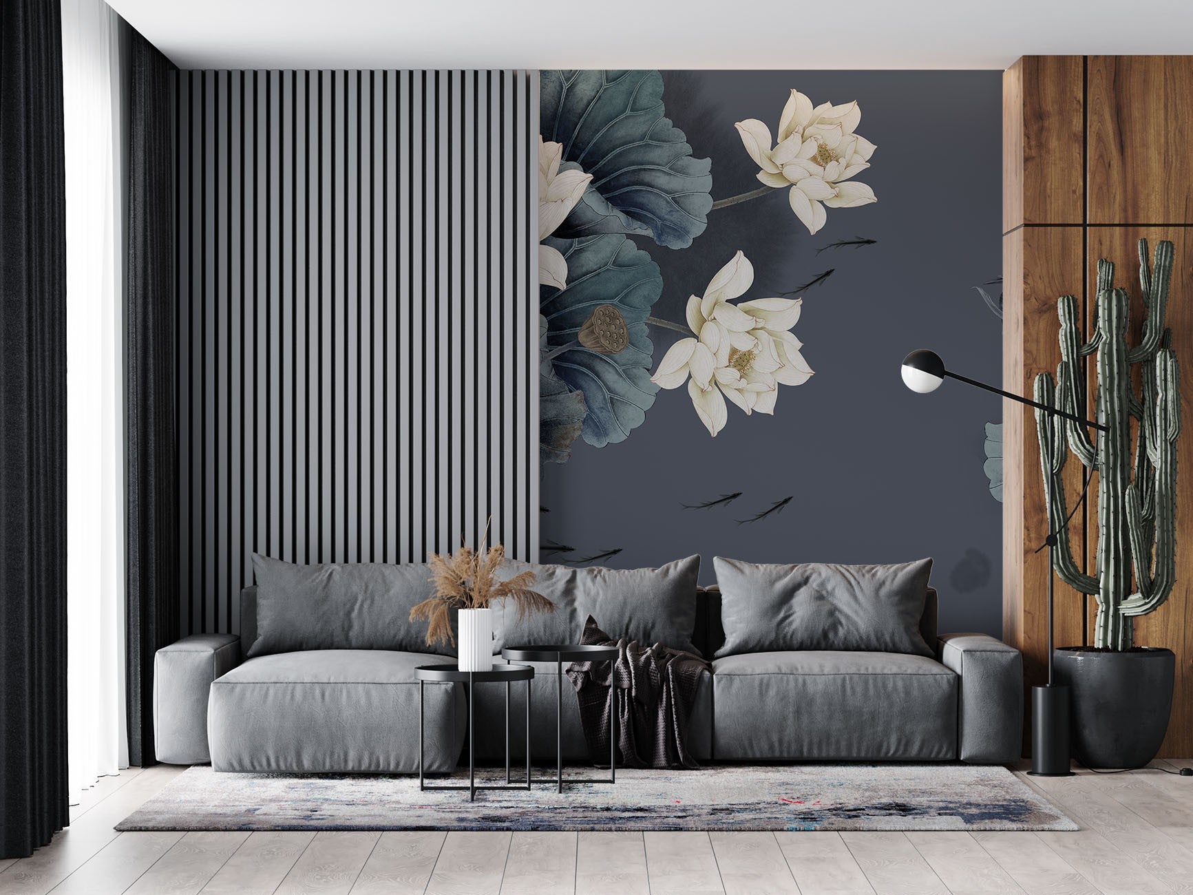 Lotus Fish Floral Flowers Dark Wallpaper Mural