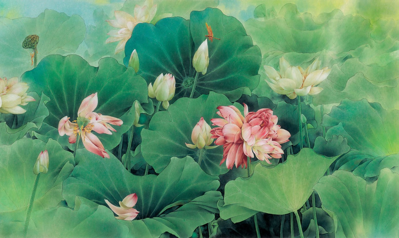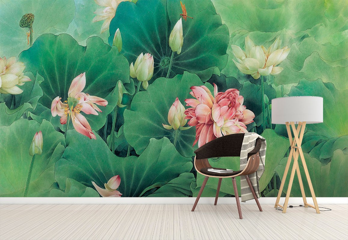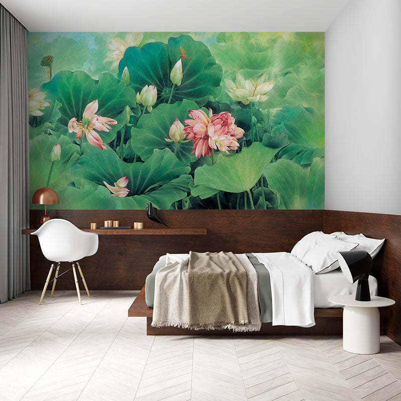 Lotus Floral Dutch Flowers Green Wallpaper Mural,Self-Adhesive Peel And Stick 3D Wall Decal,Designer Bedroom Wall Decor