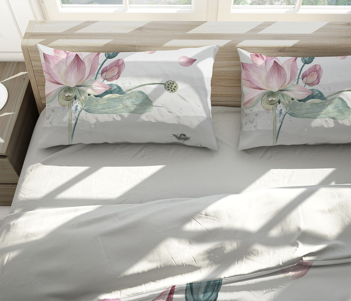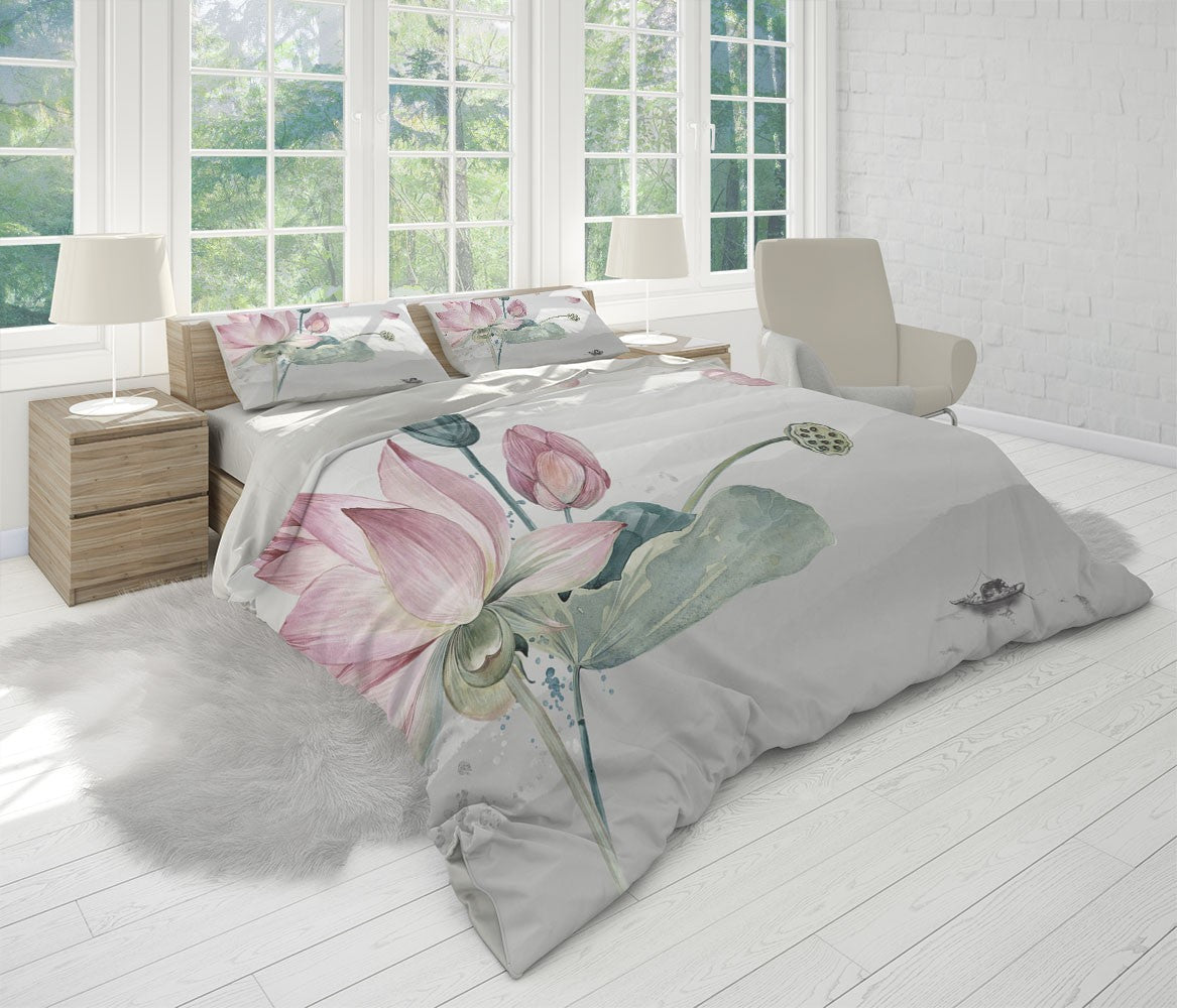 Lotus Floral Flowers Pink 3D Duvet Cover Set W Pillow Cover, Single Double Queen King Size, Printed Cotton Quilt Doona Cover 3 Pcs