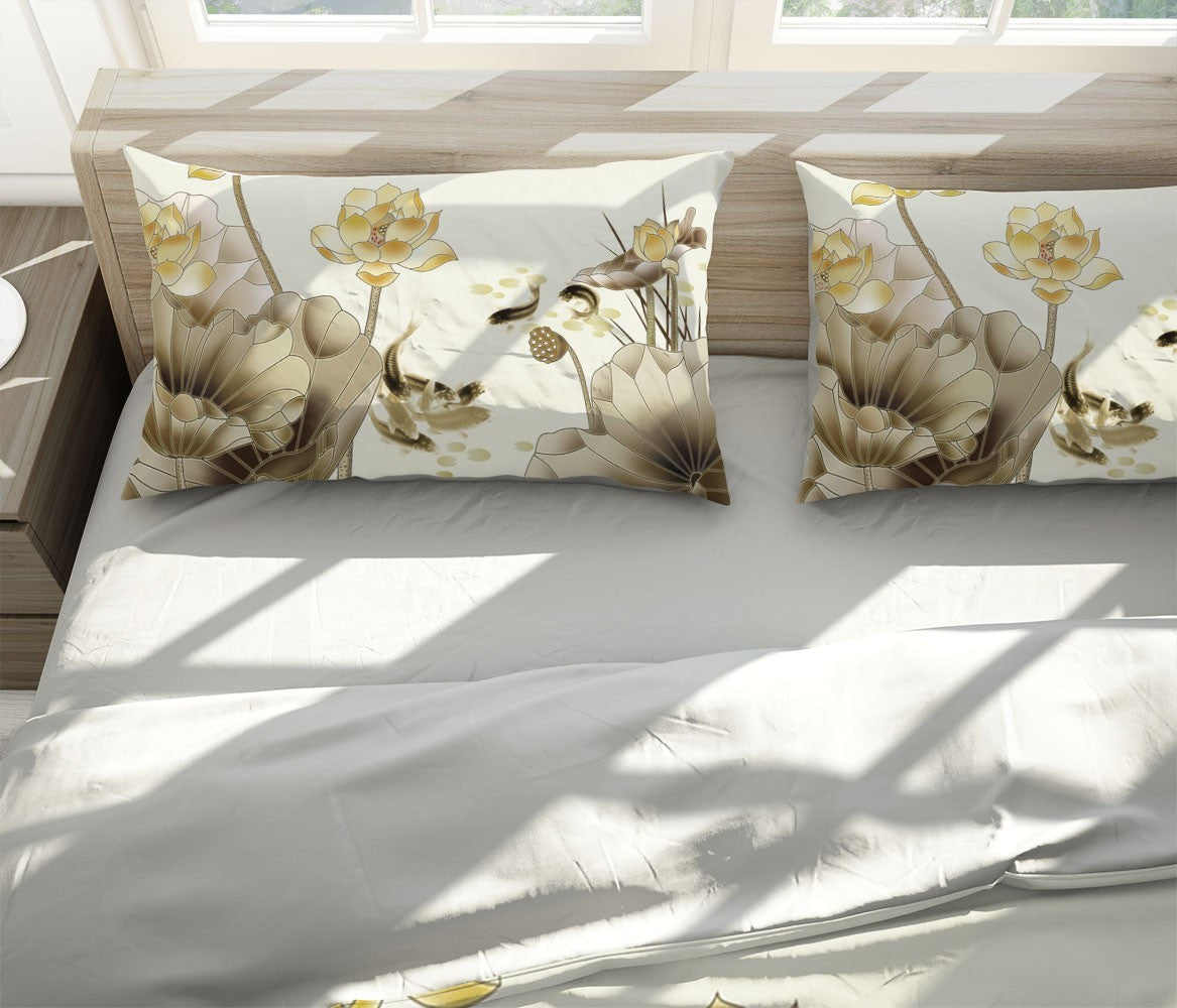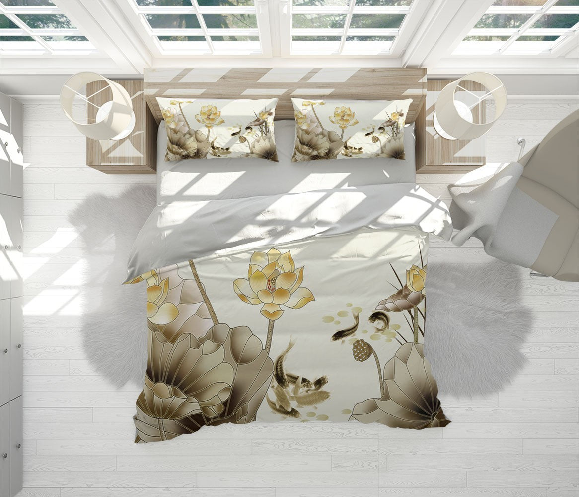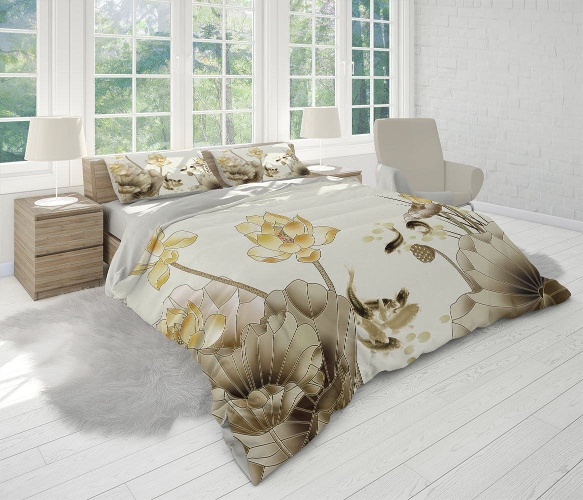 Lotus Koi Duvet Cover Set W Pillow Cover, Brown Art Chinoiserie 3D Quilt Cover, Single Double Queen King Size Doona Cover