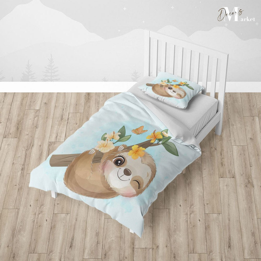 Lovely Sloth Duvet Cover Set w Pillow Cover, Green Kids Animal 3D Quilt Cover, Single Double Queen King Size Doona Cover