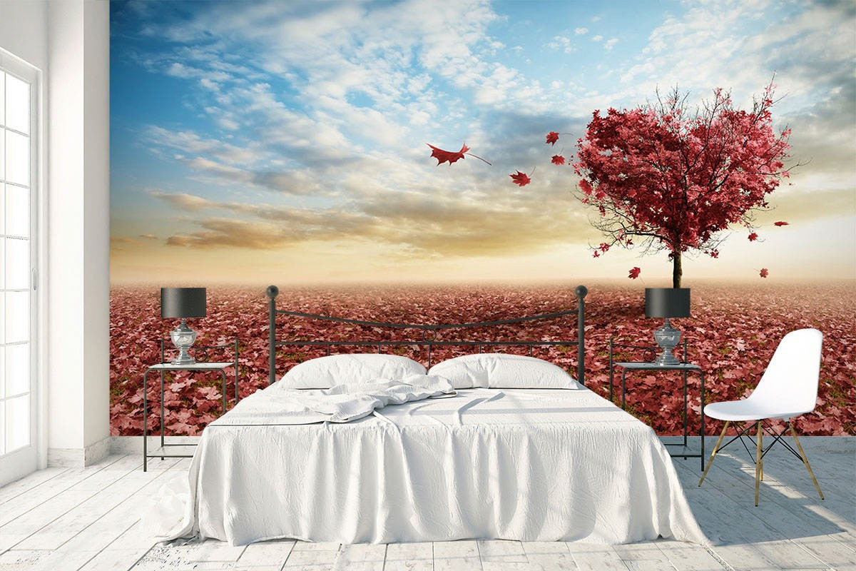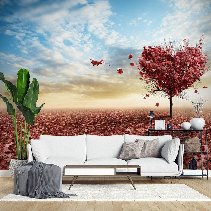 Maple Grassland Floral Leaves Red Wallpaper Mural,Self-Adhesive Peel And Stick 3D Wall Decor,Designer Bedroom Wall Decor