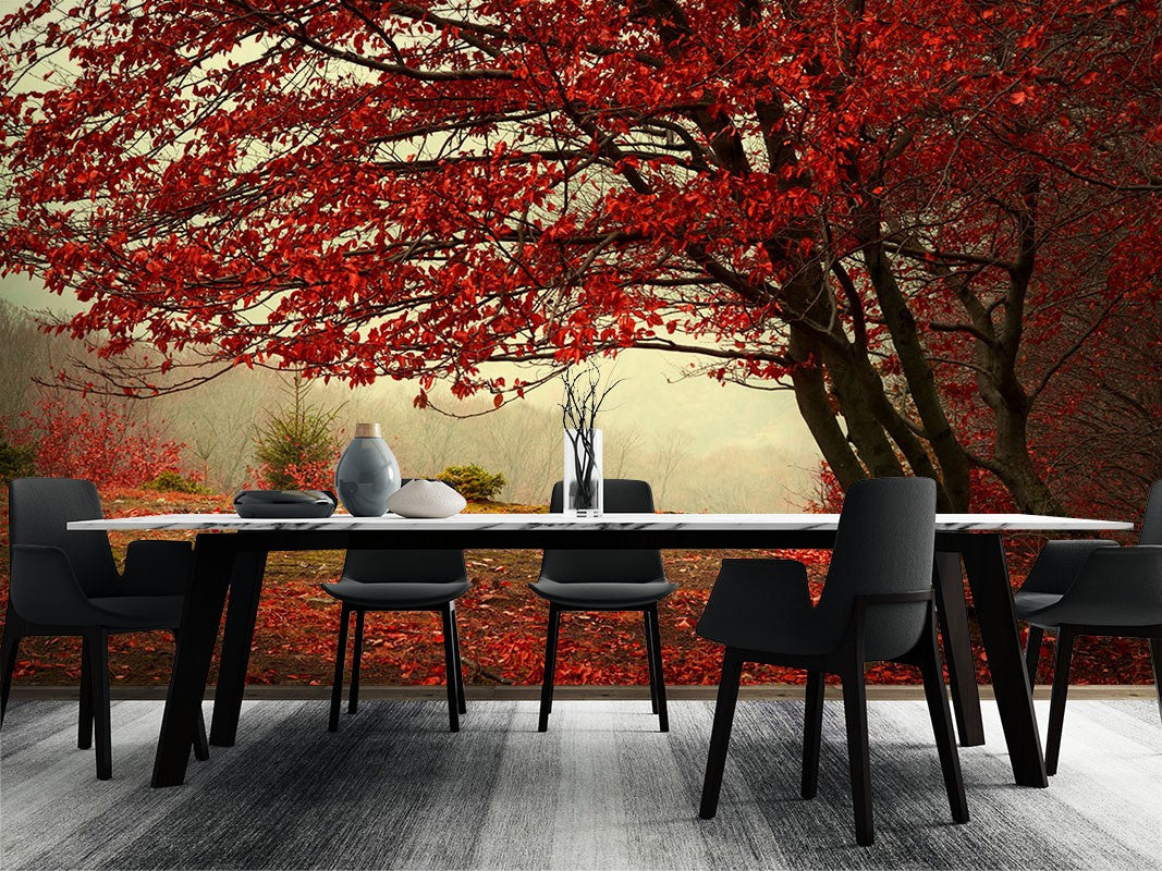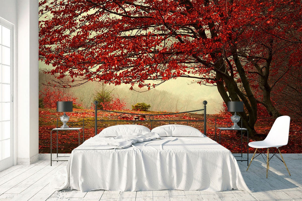 Maple Leaf Forest Seasons Red Wallpaper Mural,Self-Adhesive Peel And Stick 3D Wall Decal,Removable Bedroom Wall Decor
