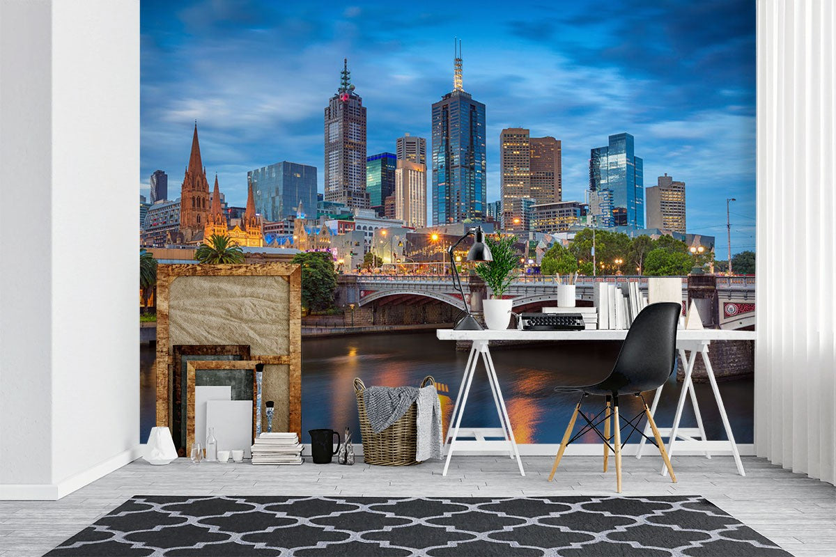 Melbourne Yarra City Landmarks Blue Wallpaper Mural,Self-Adhesive Peel And Stick 3D Wall Decal,Bedroom Australian Company Wall Decor
