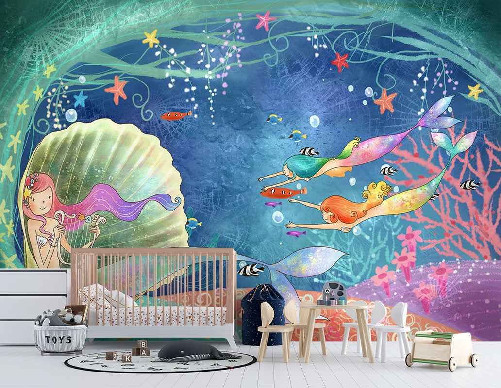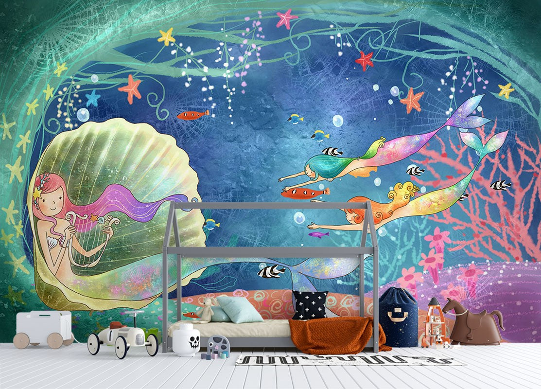 Mermaids Kids Fantasy Green Wallpaper Mural,Self-Adhesive Peel And Stick 3D Wall Mural,Bedroom Australian Company Wall Decor